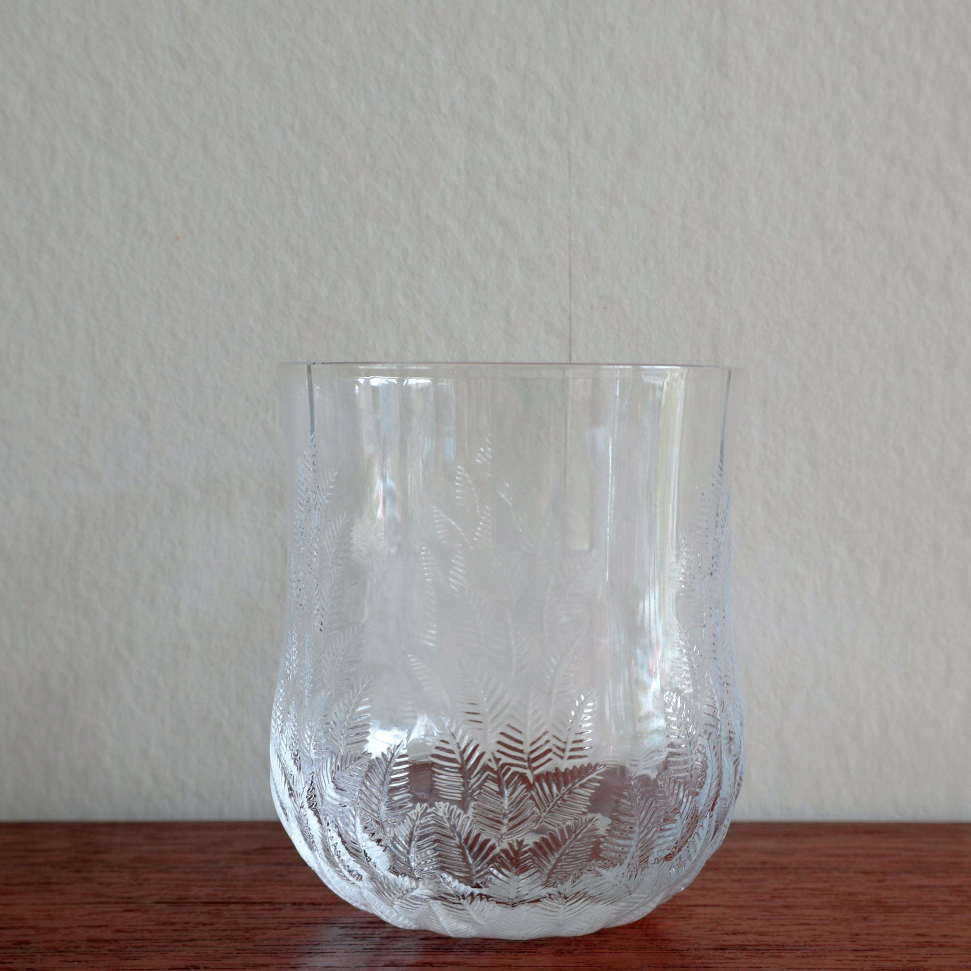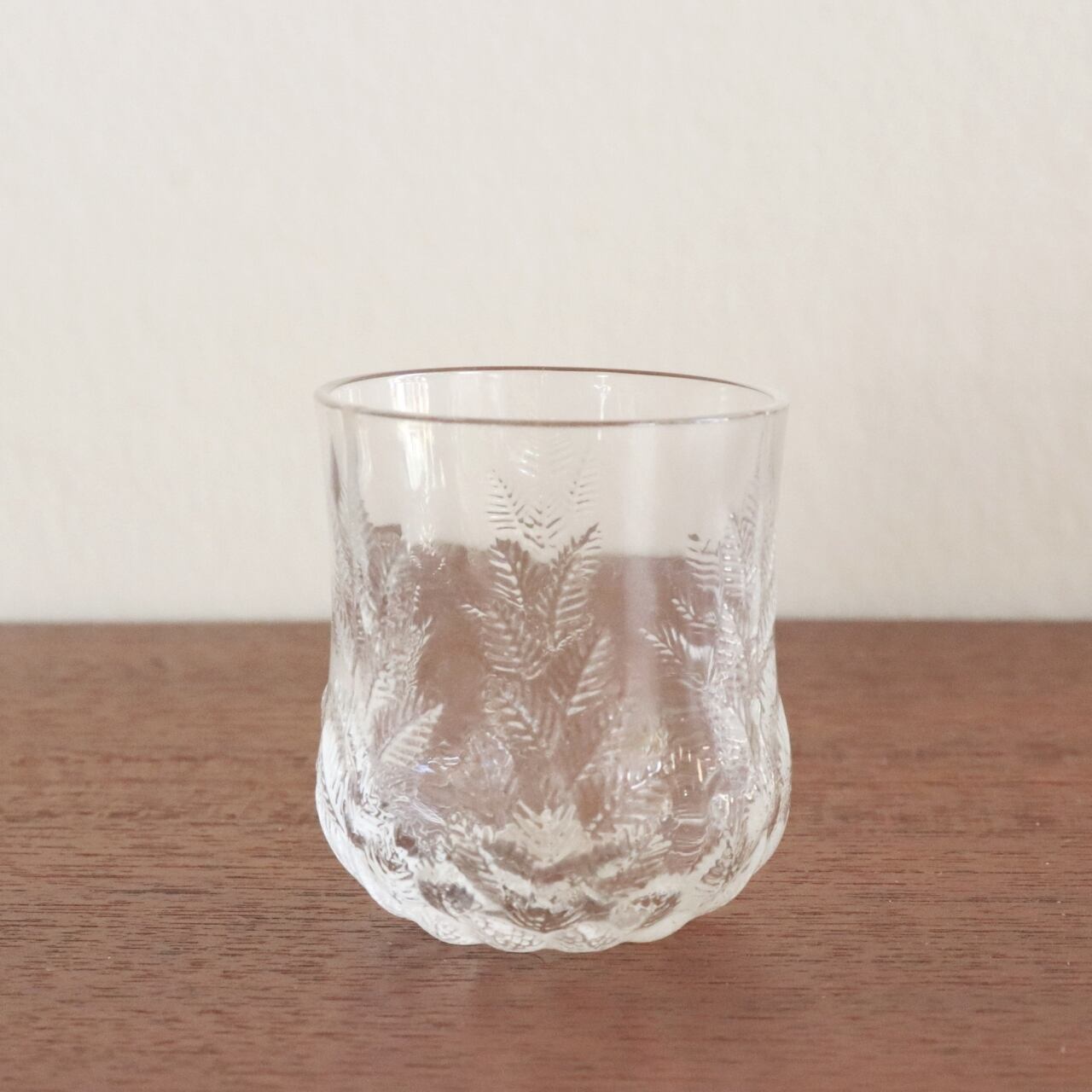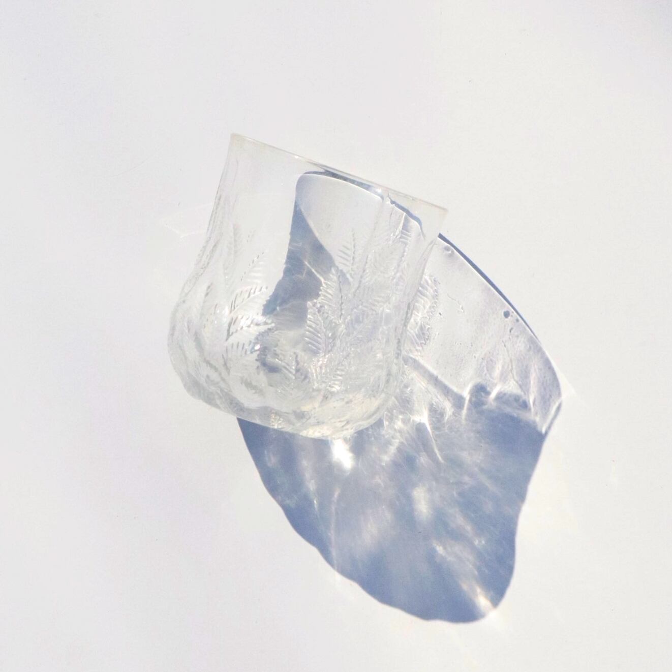 Koivu=白樺という意味の名前です。ガラスの表面にエンボスで白樺の葉が繊細に描かれています。ヨルマ・ヴェンノラはKuusiのデザインでも知られておるデザイナーで、厚手と薄手と違いはありますがどちらも光の揺らめぎが美しいシリーズです。