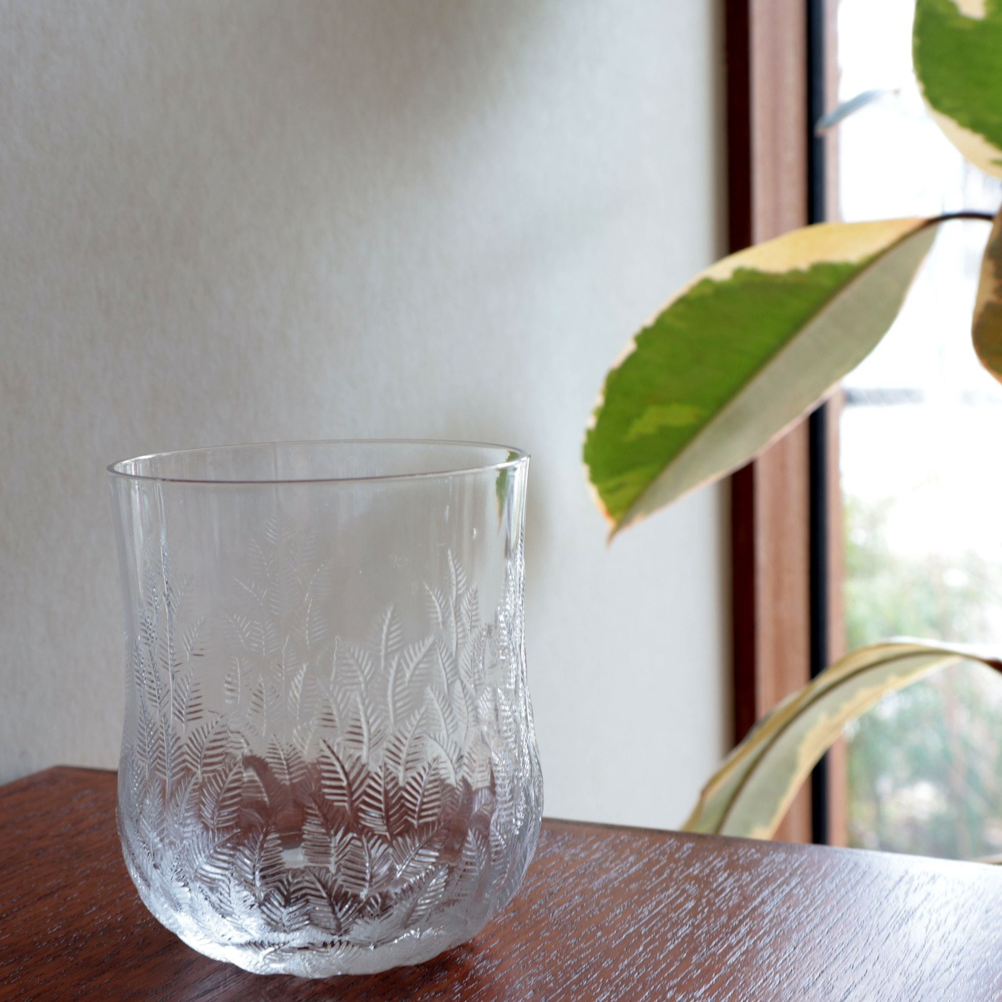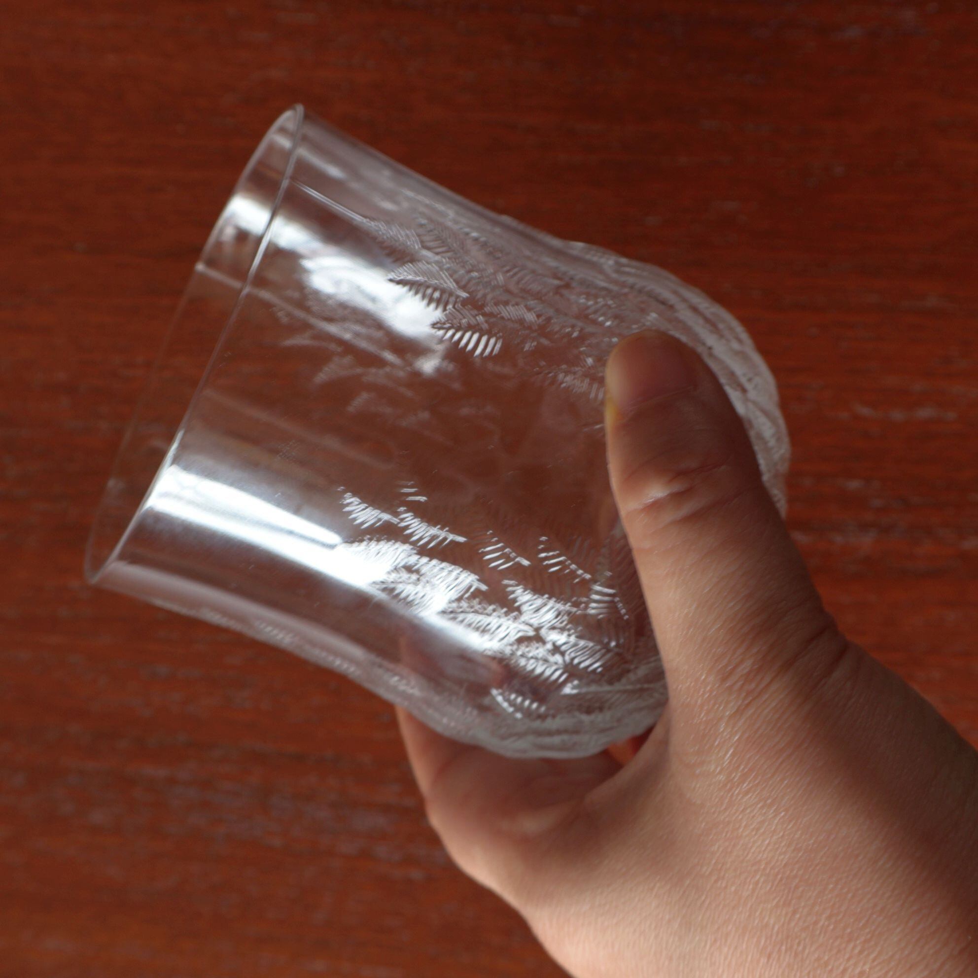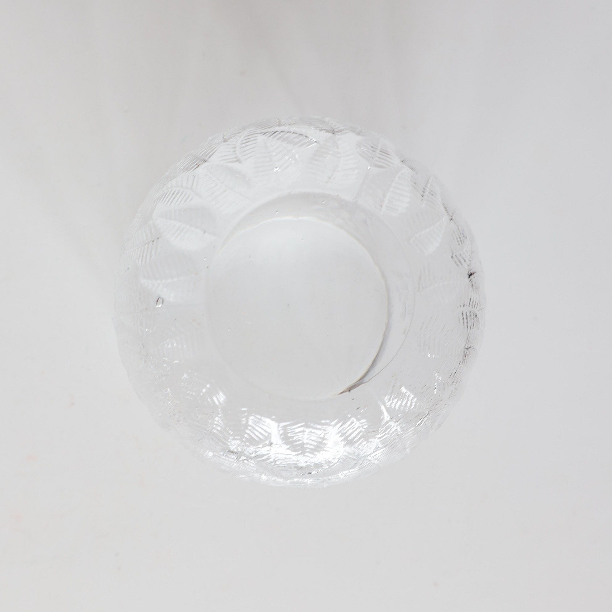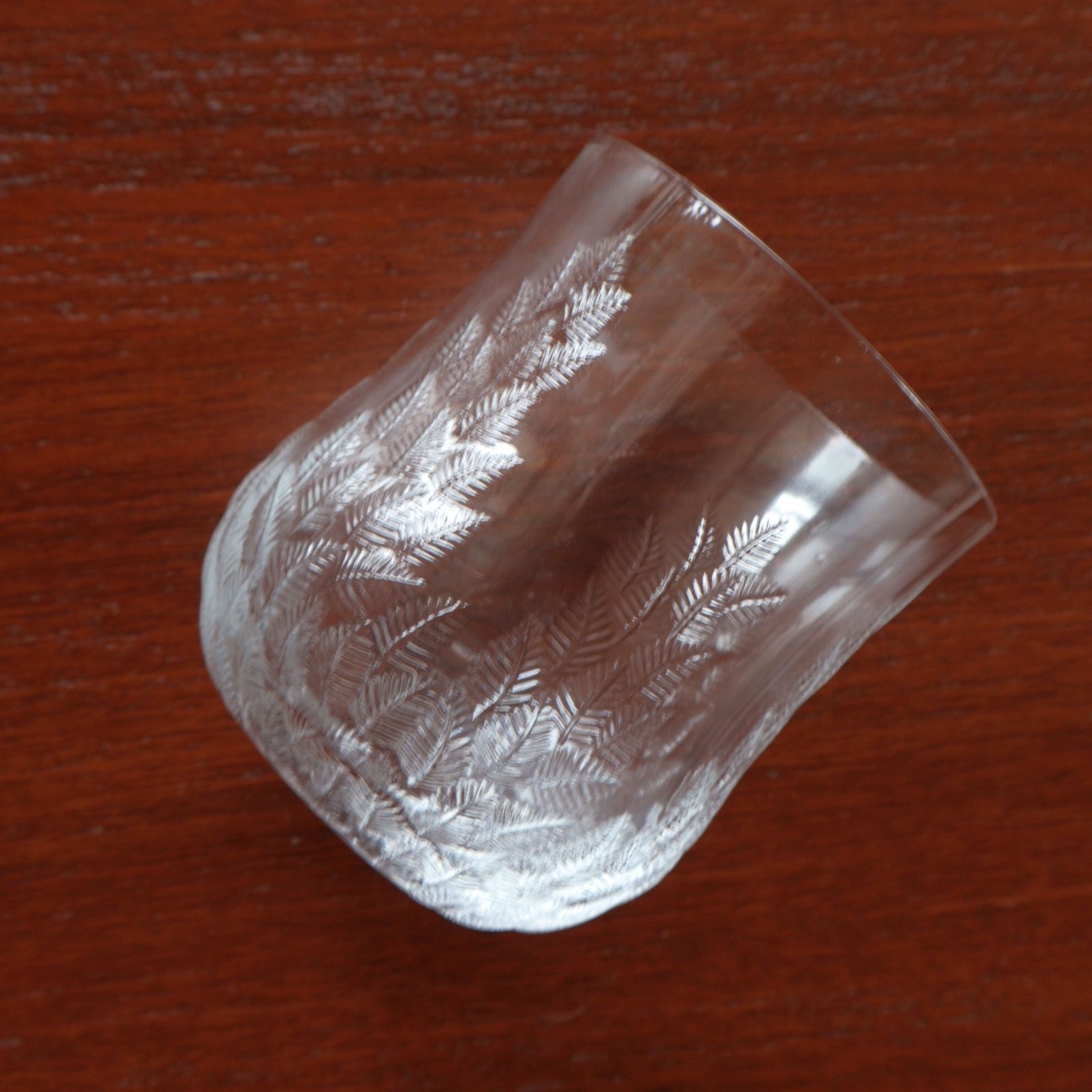 Koivu=白樺という意味の名前です。ガラスの表面にエンボスで白樺の葉が繊細に描かれています。ヨルマ・ヴェンノラはKuusiのデザインでも知られておるデザイナーで、厚手と薄手と違いはありますがどちらも光の揺らめぎが美しいシリーズです。