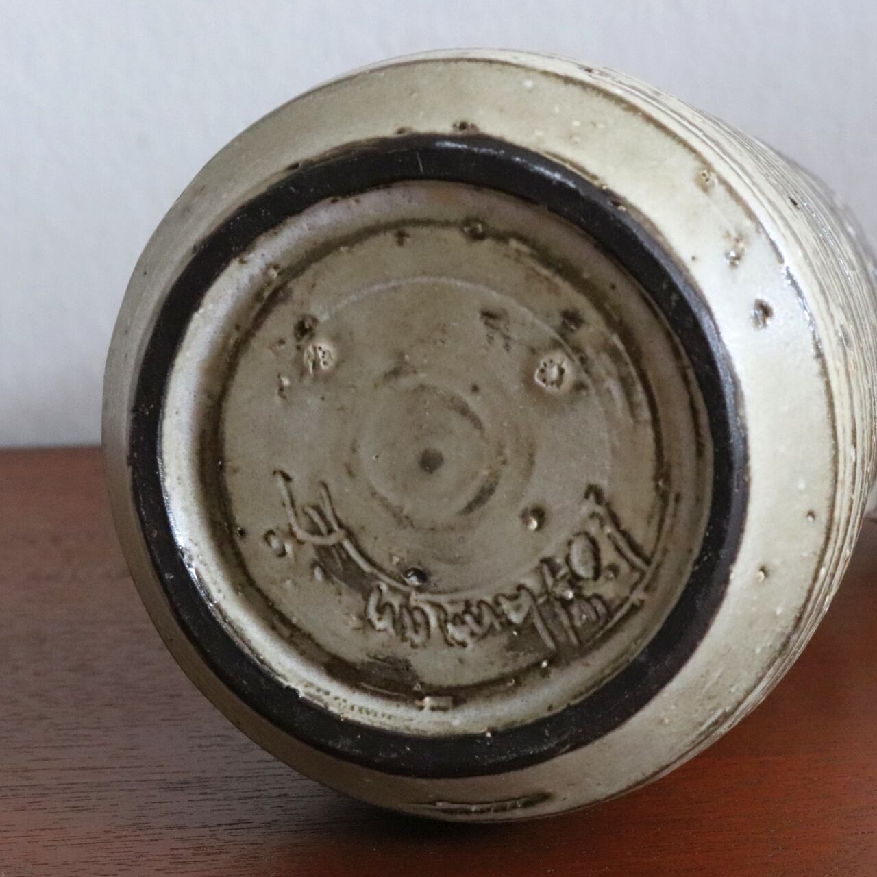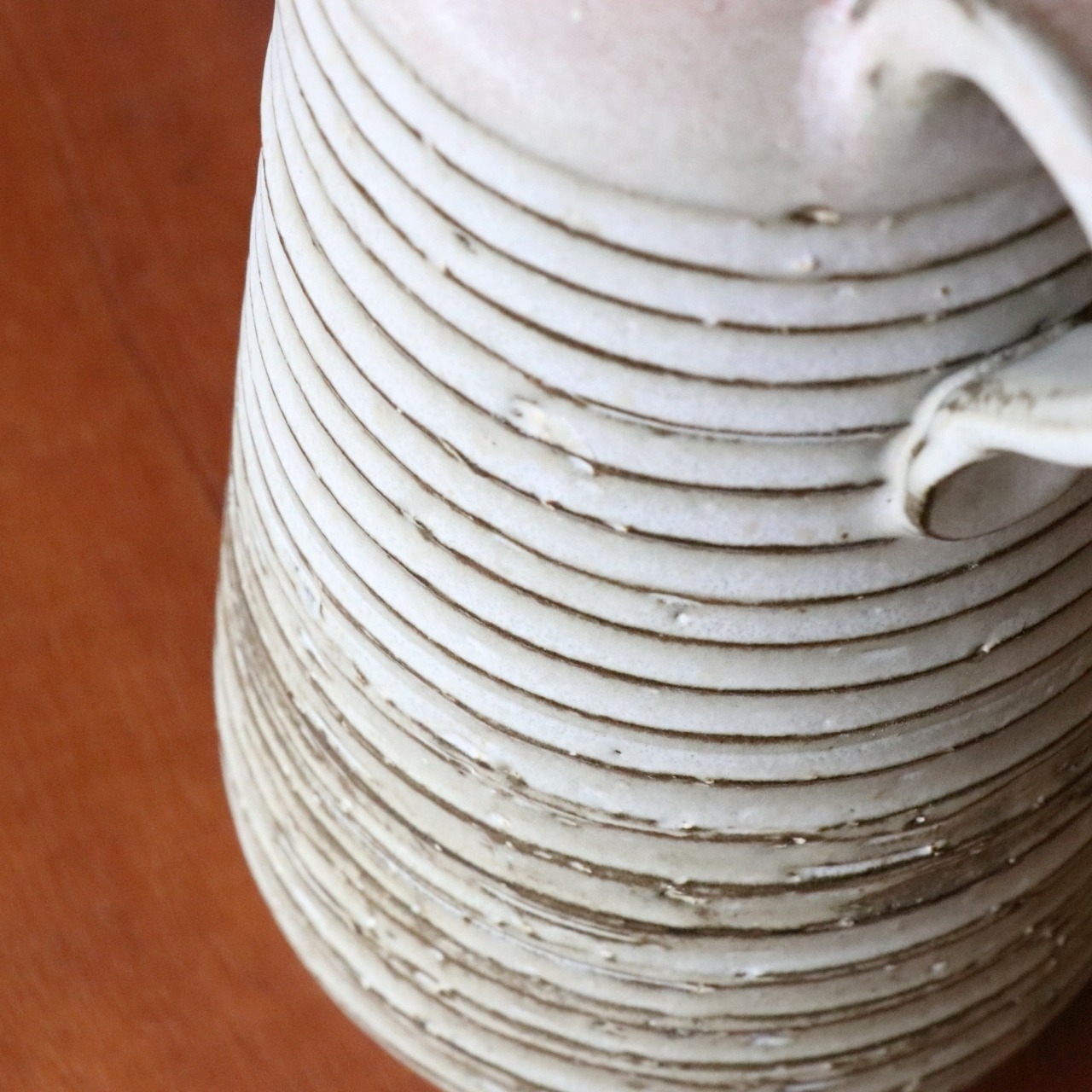 素朴でざっくりとかけられた釉薬が特徴的で、水差し型のフォルムと相まって日本的な空間ともとても相性が良さそうな一点です。