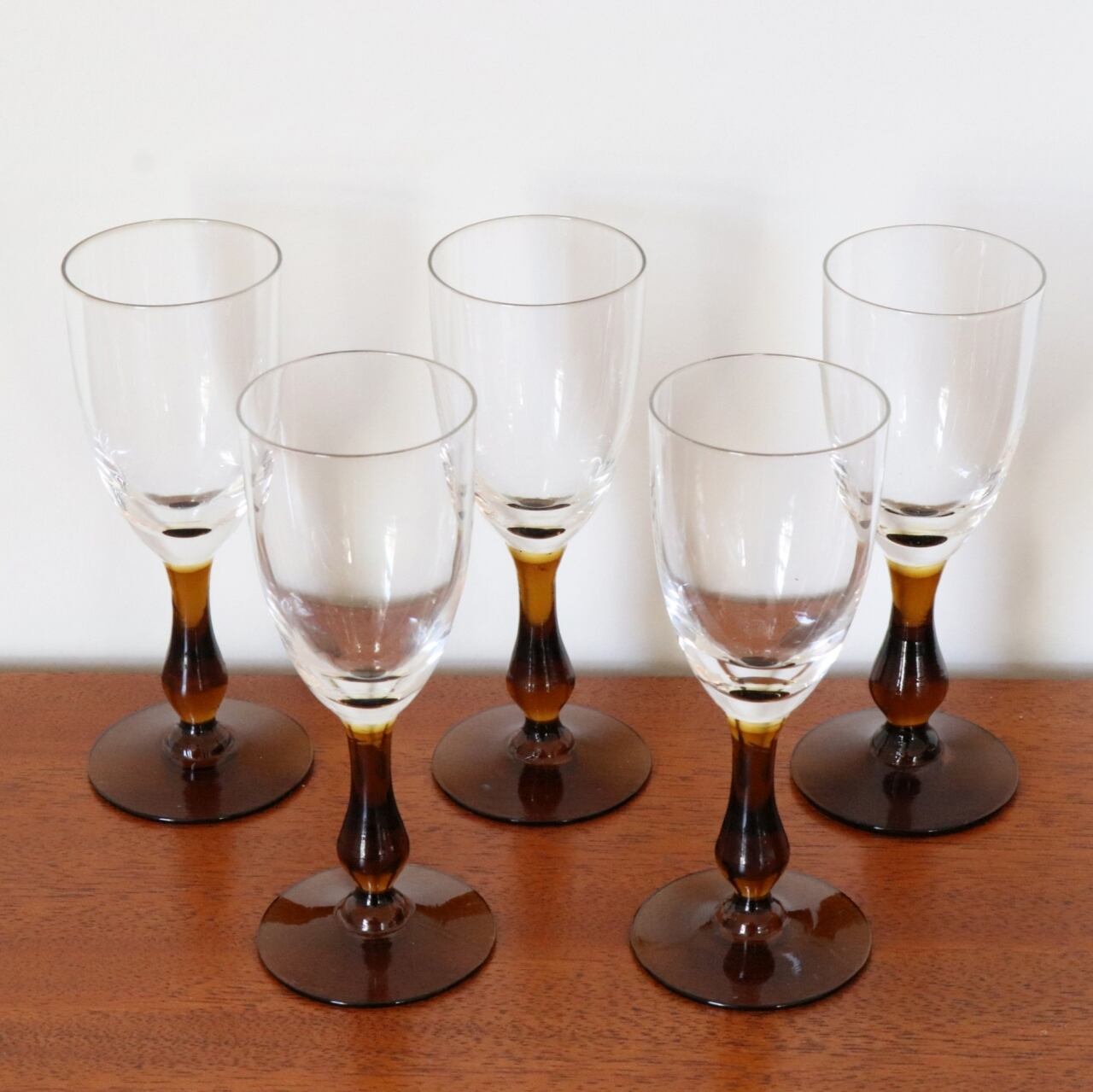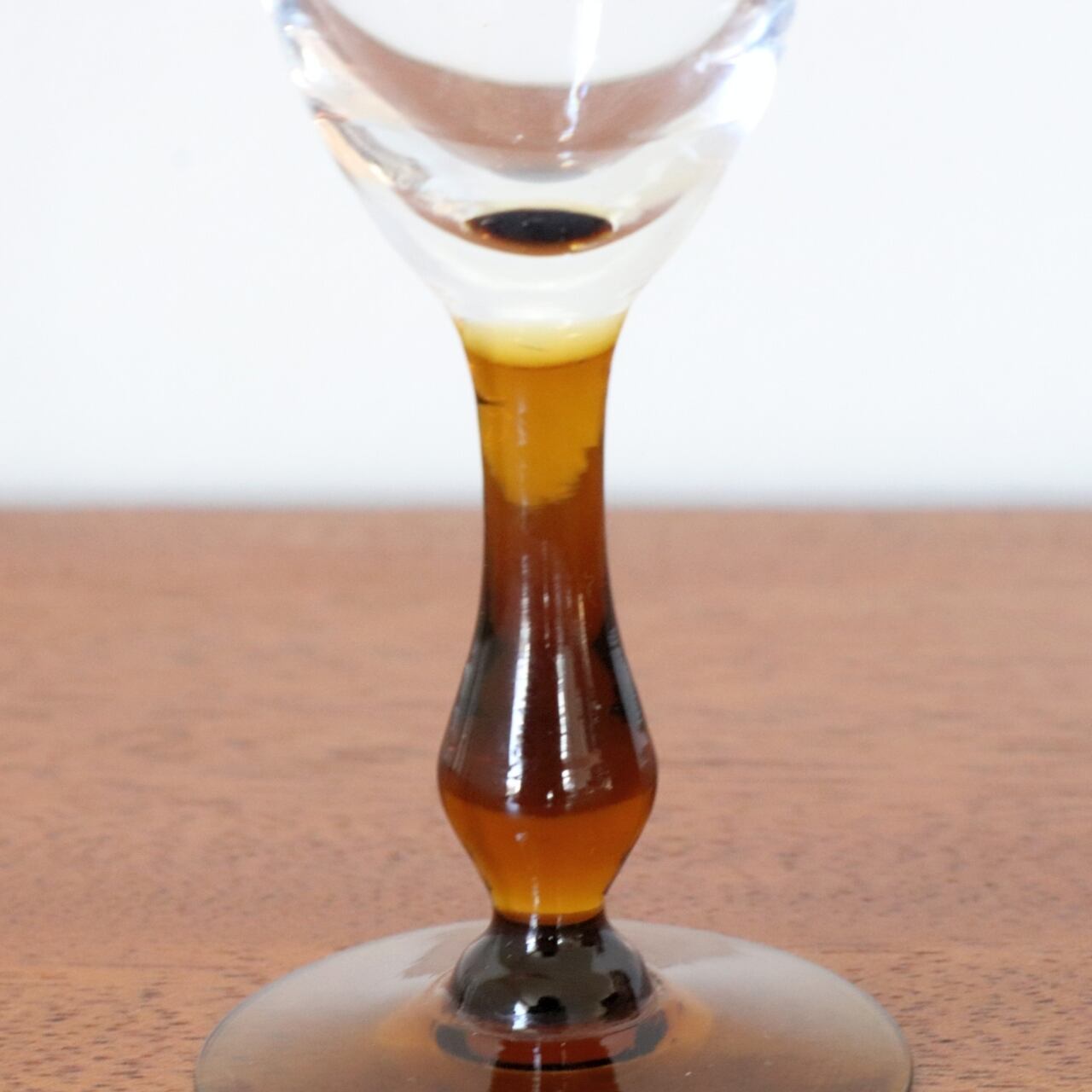 透明なグラス部分と、琥珀色のフット部分のバランスが美しく、とても滑らかな仕上がりです。食前酒などに利用されたほか、前菜などにも使われていたような小さめで可愛いグラスです。
