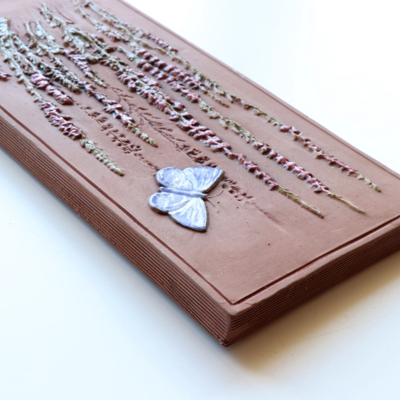 【c6072】蝶とカルーナ(ギョリュウモドキ)の陶板(27㎝) [Jie gantofta / Sweden]