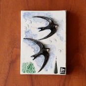同社の創業者の息子であり、また鳥類学者でもあったStaffan Johnsonによる作品となります。ヨーロッパアマツバメをモチーフにしたもので、空を飛び交う様子が闊達に描かれています。背面には通し穴と針金が付いていますので、そのまま壁に飾ることも可能です。