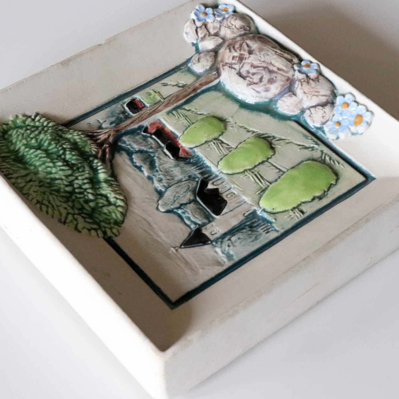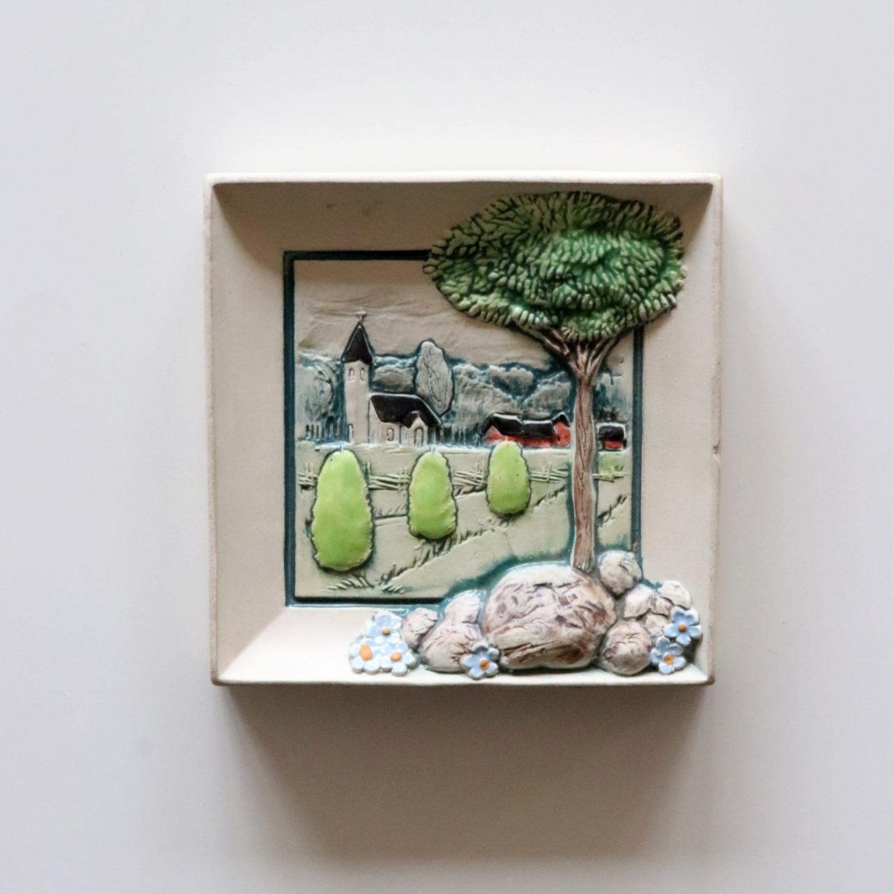 同社の代表的デザイナーAimo Nietosvuori による作品。他の陶板に比べ少し立体的な額縁状に製作されており、スウェーデンの田舎の村の風景を写した作品です。