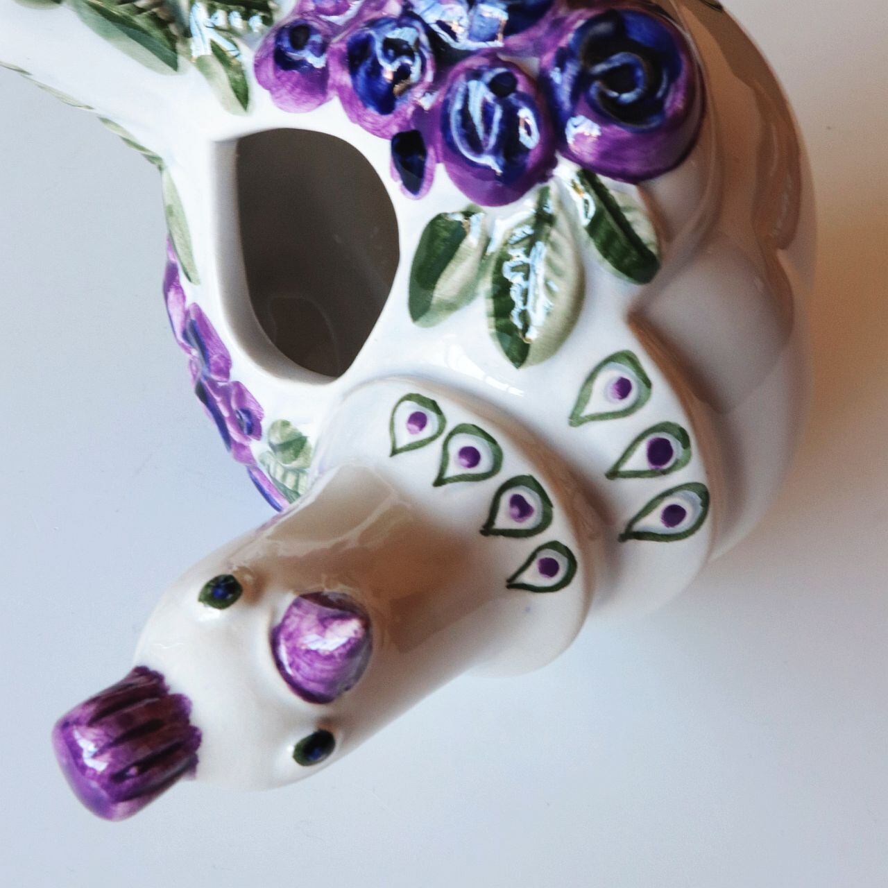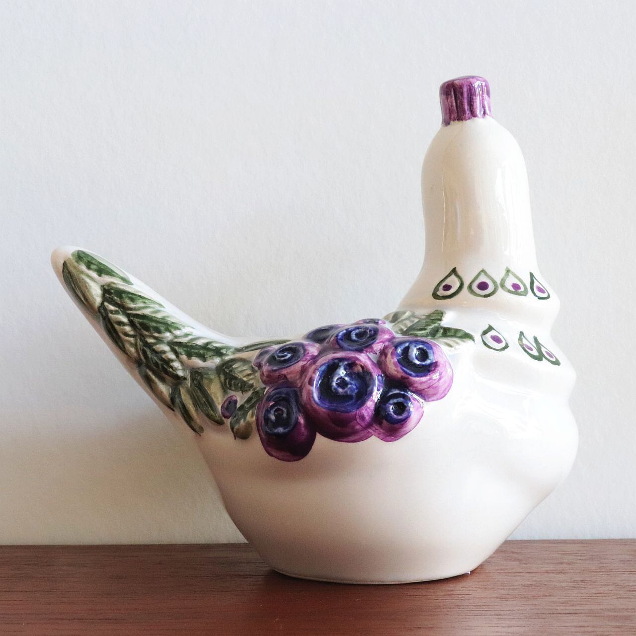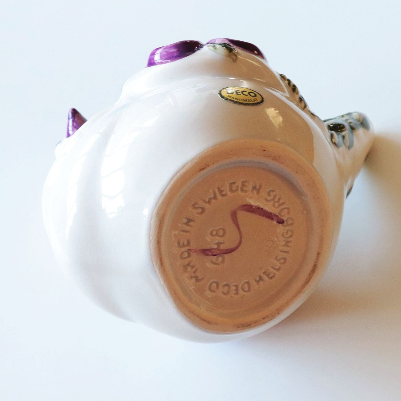スウェーデンの陶芸家Rosa Ljung(ローサ・ユング)によって1970〜80年代にデザインされた、鳥のかたちをしたフラワーベース。製作はHelsingborg(ヘルシンボリ)の陶器メーカー〈Deco〉によるもので、彼女の代表的なモチーフのひとつである鳥と花の装飾が印象的な作品です。