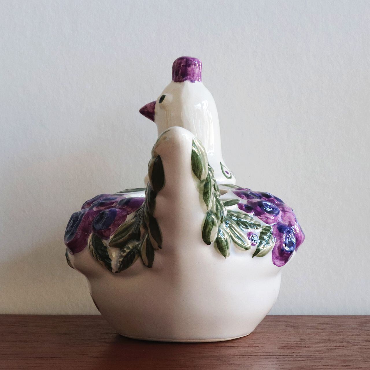 白い陶肌に手描きで彩色された紫やグリーンの花模様が、素朴でありながら華やかさを添えており、北欧らしい優しい空気感をまとった一品。丸みを帯びたフォルムと愛らしい表情が、空間に柔らかなリズムをもたらしてくれます。