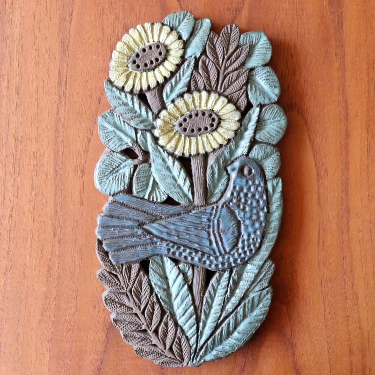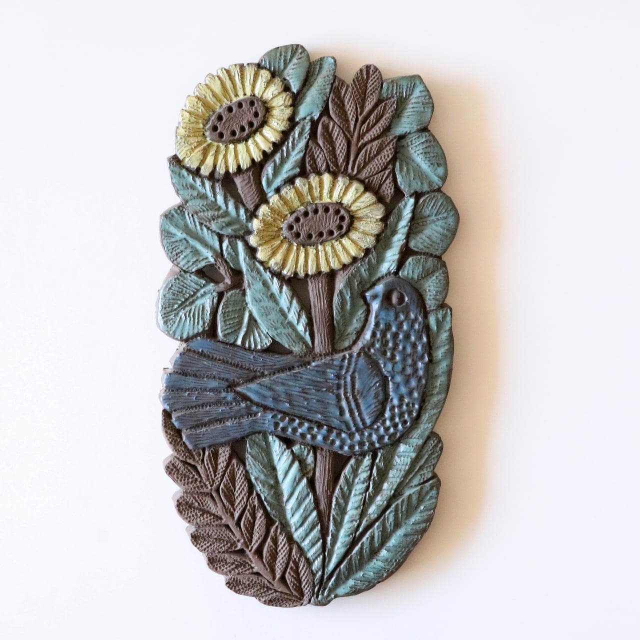 【c6107】鳥と向日葵の陶板(32cm) / Dagny Zachrisson[Törngrens krukmakeri / Sweden]