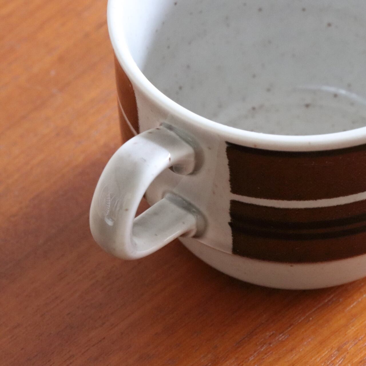 斑模様のあるクリーム色の素地に、ブラウンとブラックのストライプが絶妙なバランスで描かれています。カップはスタッキングが出来るように設計されており、レトロながら機能的な仕上がりとなっています。
