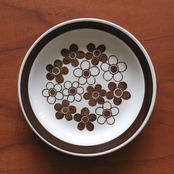 掠れたような独特のテクスチャで描かれた花模様が特徴的です。白地にブラウンが中心ですが、花柄がブルーとなったパターンも製作されています。パターンの花柄はスクリーンプリントで、縁取りやディーププレートの中央部は筆や刷毛で描いたもので、かすれ具合や柄の出方がそれぞれ少しずつ異なっています。同様の仕上げはロールストランド社でも他に例が無く、どの機械を使って仕上げたものかは不明とされている不思議なシリーズです。