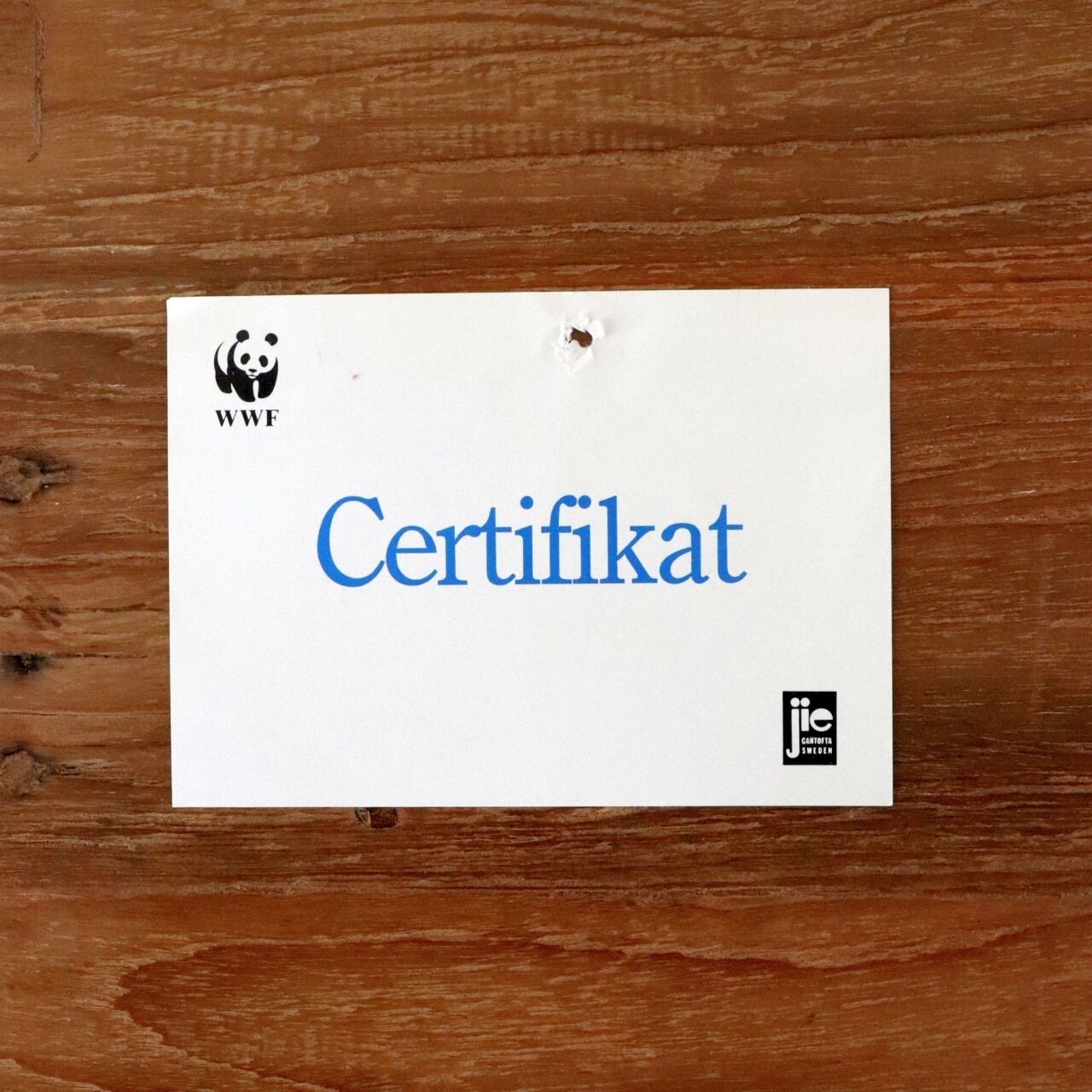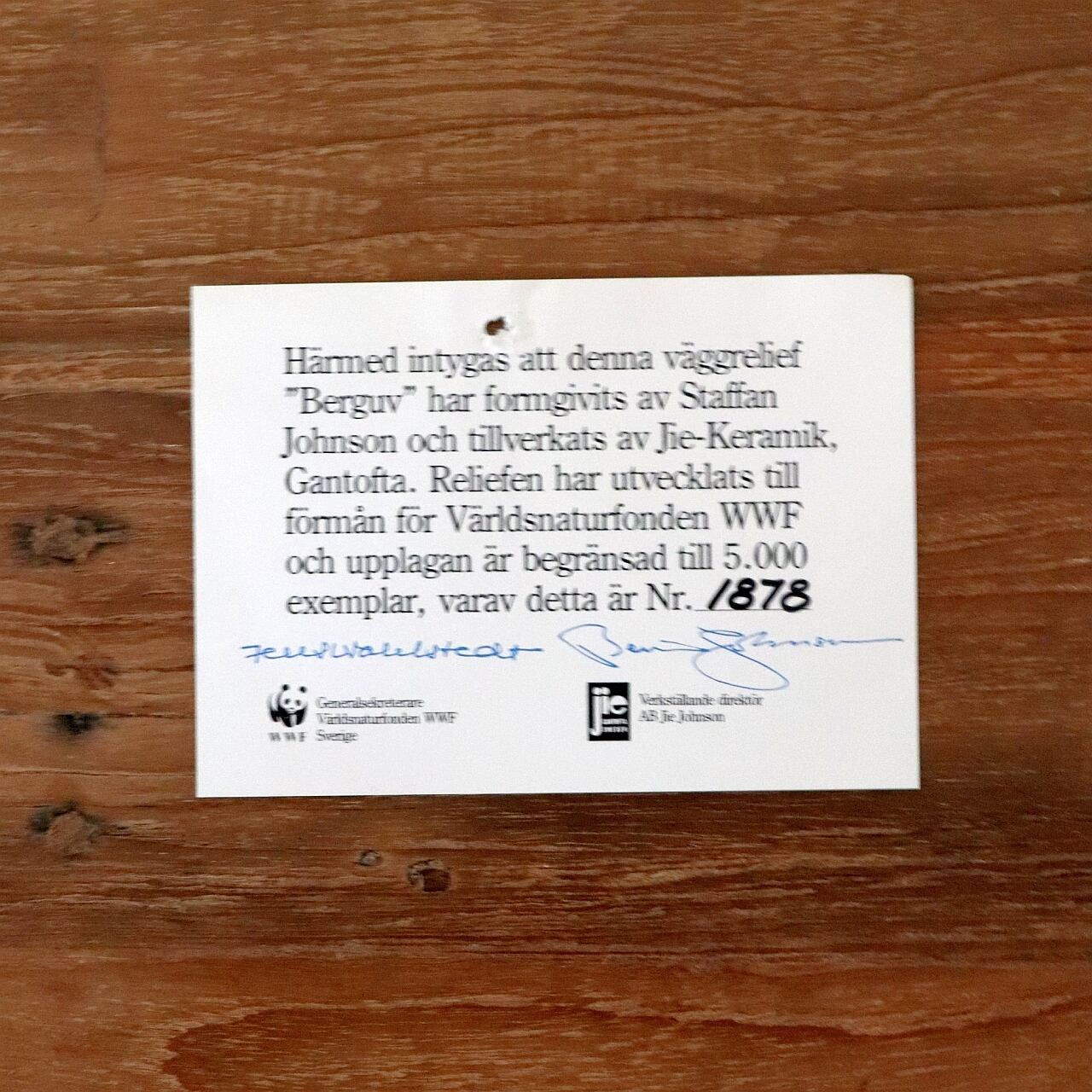 ”この「ワシミミズク」の壁面レリーフ(陶板)は、Staffan Johnson によってデザインされ、GantoftaにありますJie-Keramik によって製造されたことをここに証明します。こ のレリーフは WWFの利益のために製作されました。版数は5,000 部に限定されており、そのうちの1878番となります”