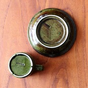 こちらは初期に製作されたカップ&ソーサー。残念ながらシリーズの特定には至りませんでしたが、和陶を思わせる錆感のある緑から白色へと抜けていく表情も楽しいカップ&ソーサーです。