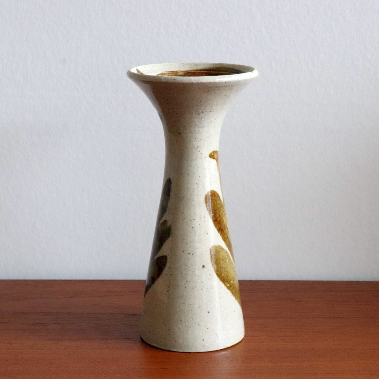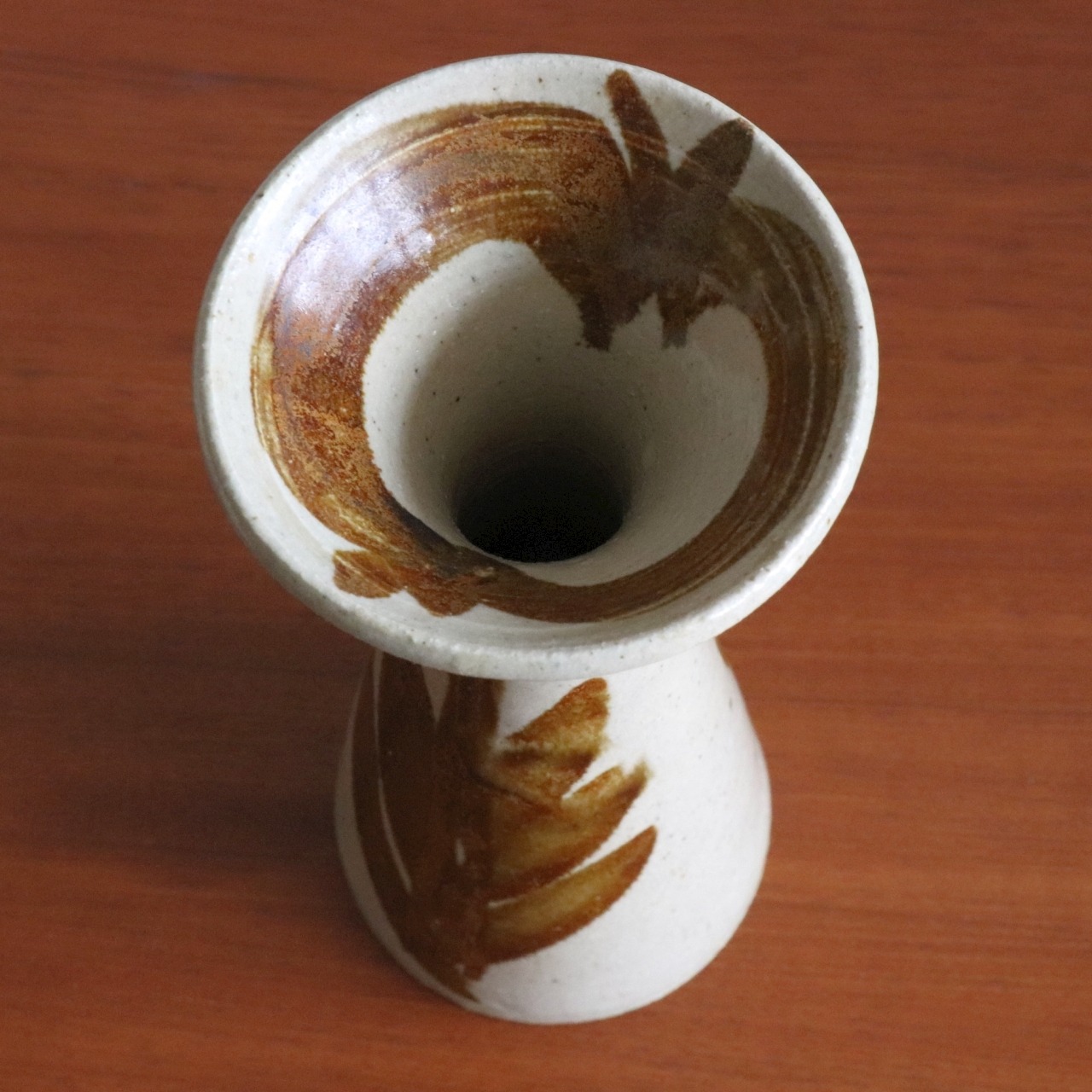 リトアニアから届いたフラワーベース。現地のお店によると1960-70年代、スウェーデンで製作されたもののようです。粗目の陶土を素焼きし、その上に手描きですっと植物の模様が描かれています。素朴で落ち着いた味わいのあるデザインで、日本的な環境にも馴染みそうな表情です。