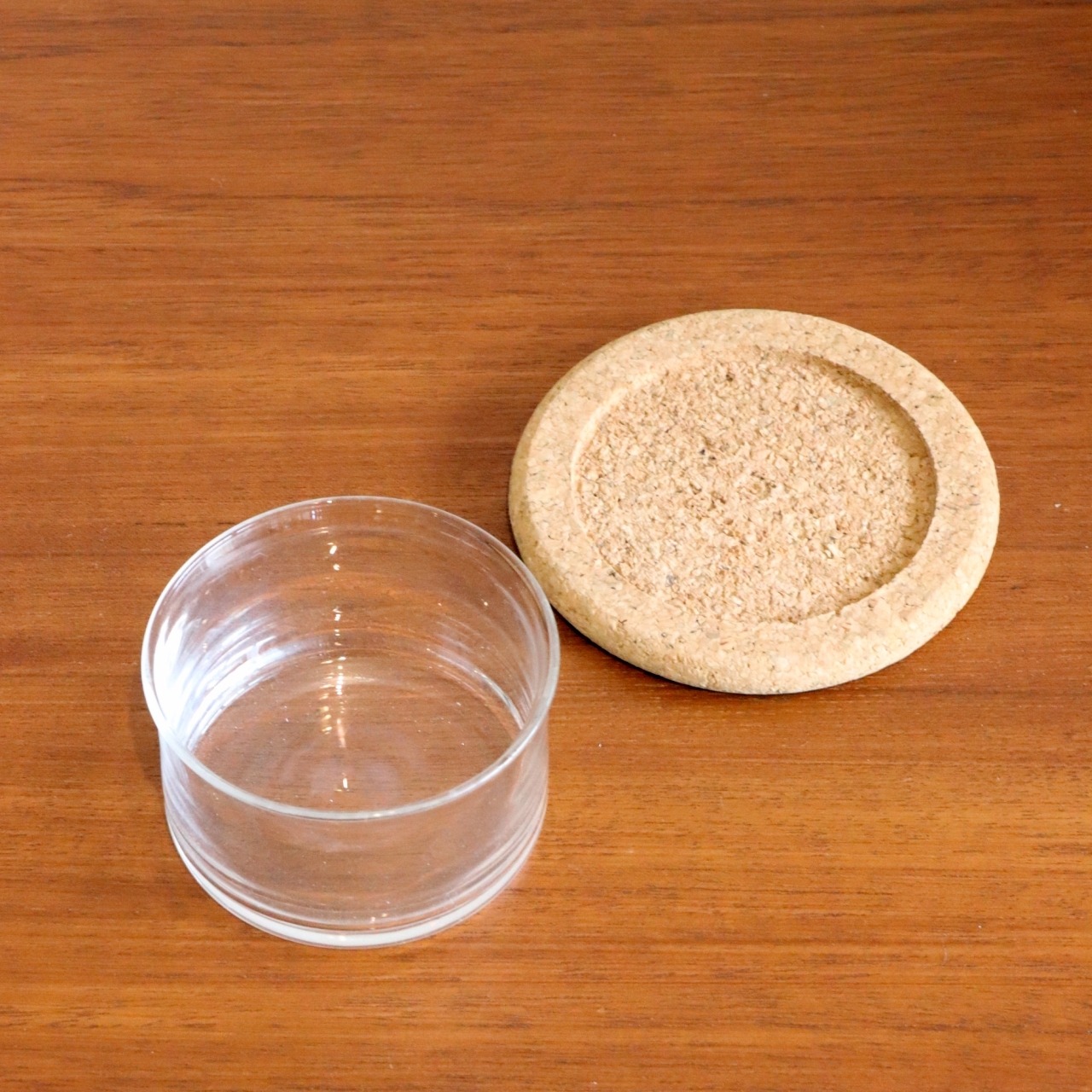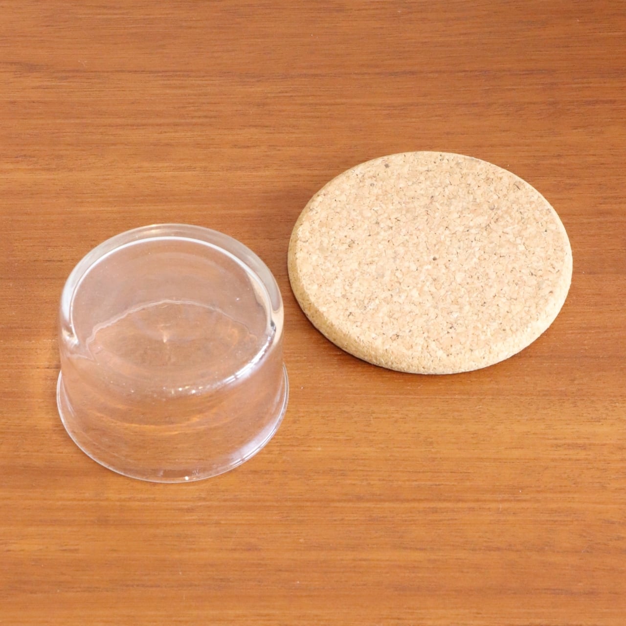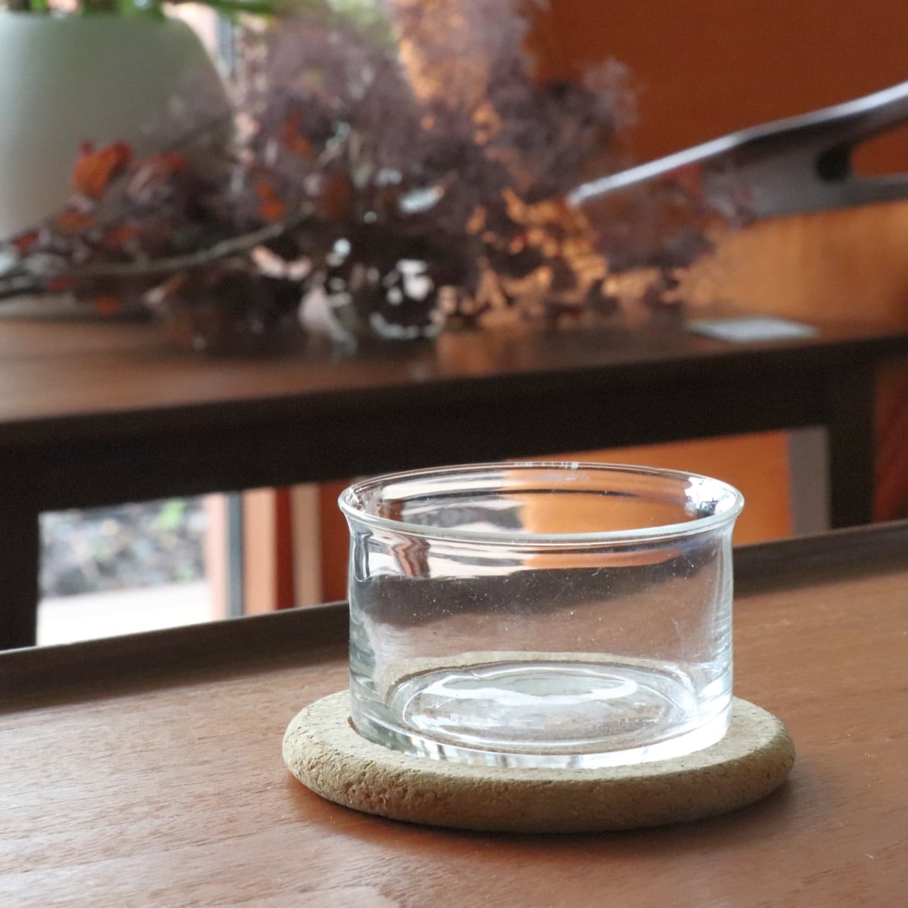 耐熱性の高いガラスを使用し、シンプルで機能的なガラスに異素材のコルクのソーサーを合わせたデザイン。悪目立ちせず、テーブルコーディネートに合わせやすいデザインです。
