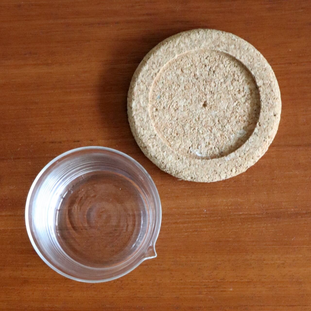 耐熱性の高いガラスを使用し、シンプルで機能的なガラスに異素材のコルクのソーサーを合わせたデザイン。悪目立ちせず、テーブルコーディネートに合わせやすいデザインです。