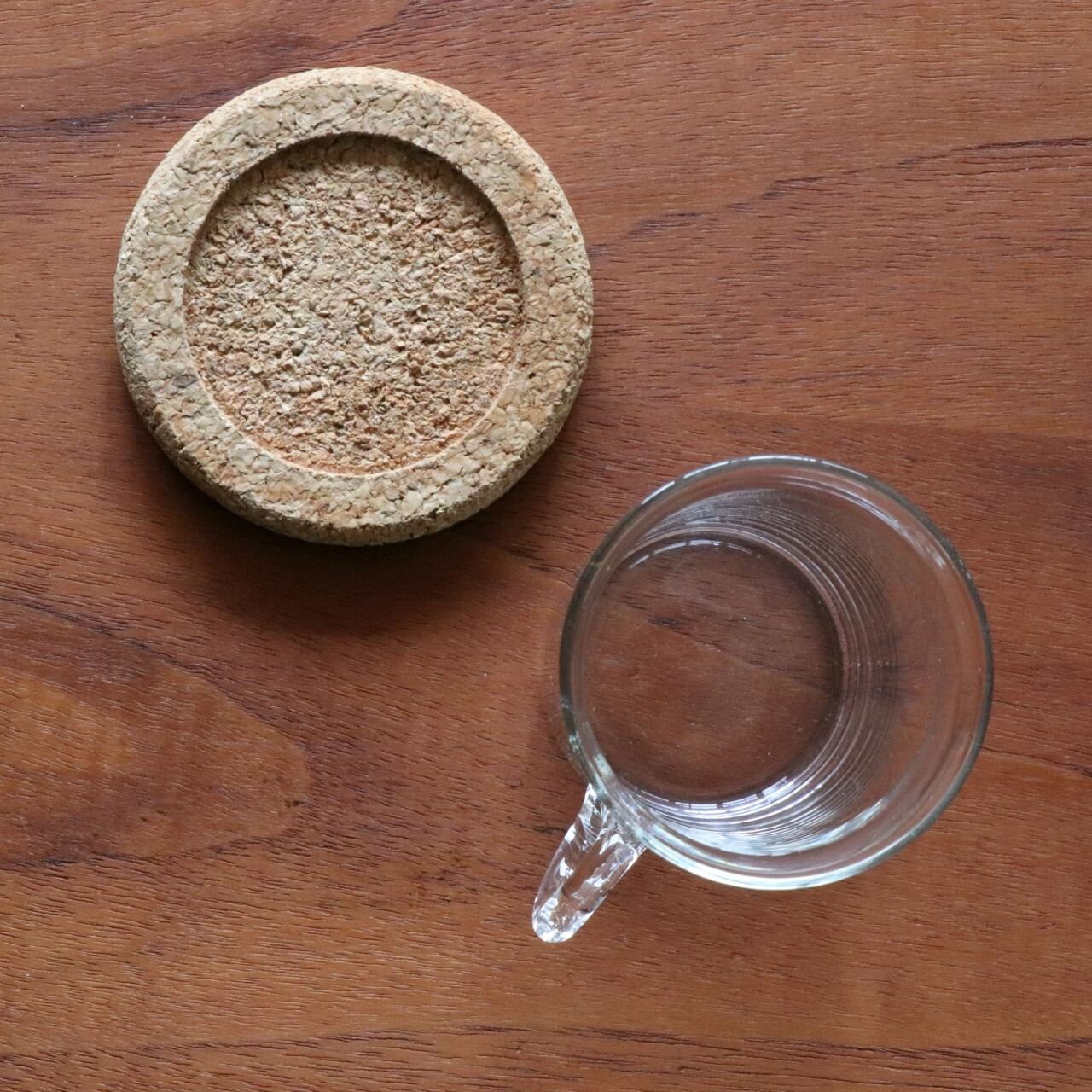 耐熱性の高いガラスを使用し、シンプルで機能的なガラスに異素材のコルクのソーサーを合わせたデザイン。カップ・ハンドル共に大きめでゆったりと使えるようなデザインです。