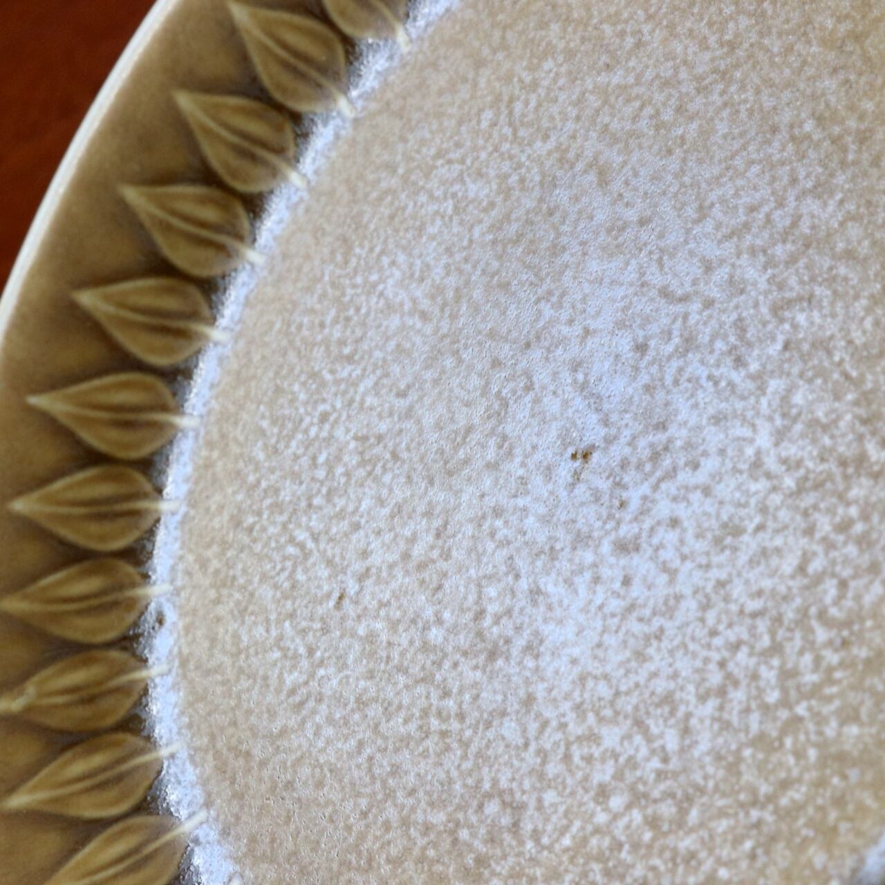 1957年から80年代にかけてデンマークで製作されたレリーフ(Relief)シリーズ。Jens.H.Quistgaardが手掛けたシリーズです。 当初はクロニーデン(Kronjyden)で製作されておりましたが親会社が変わるにつれ、Nissen、B&Gと3社にわたって製作が続けられています。 製造された工房自体は同じですが、親会社によりバックスタンプも複数あることで時代の変遷が楽しめる作品です。 基本カラーはサンドベージュですが、製造初期にごく少量ですがダークブラウンやグリーンのカラーでも製作されています。