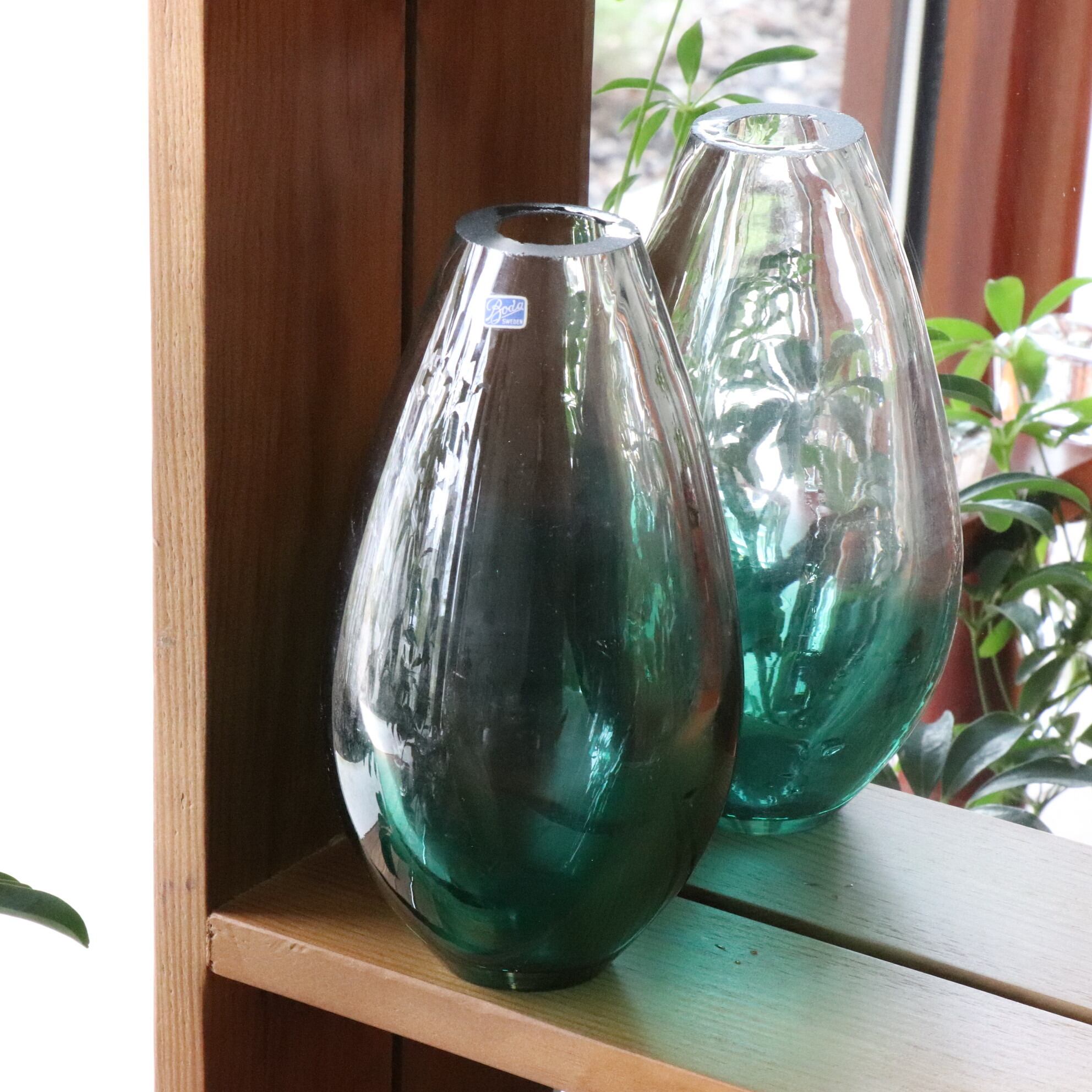 残念ながら製作者の特定には至りませんでしたが、安定感のあるフォルムとバランスの良いグラデーションに高い技術を感じる作品です。重心は低く、安定して植物が飾れそうなアイテムです。