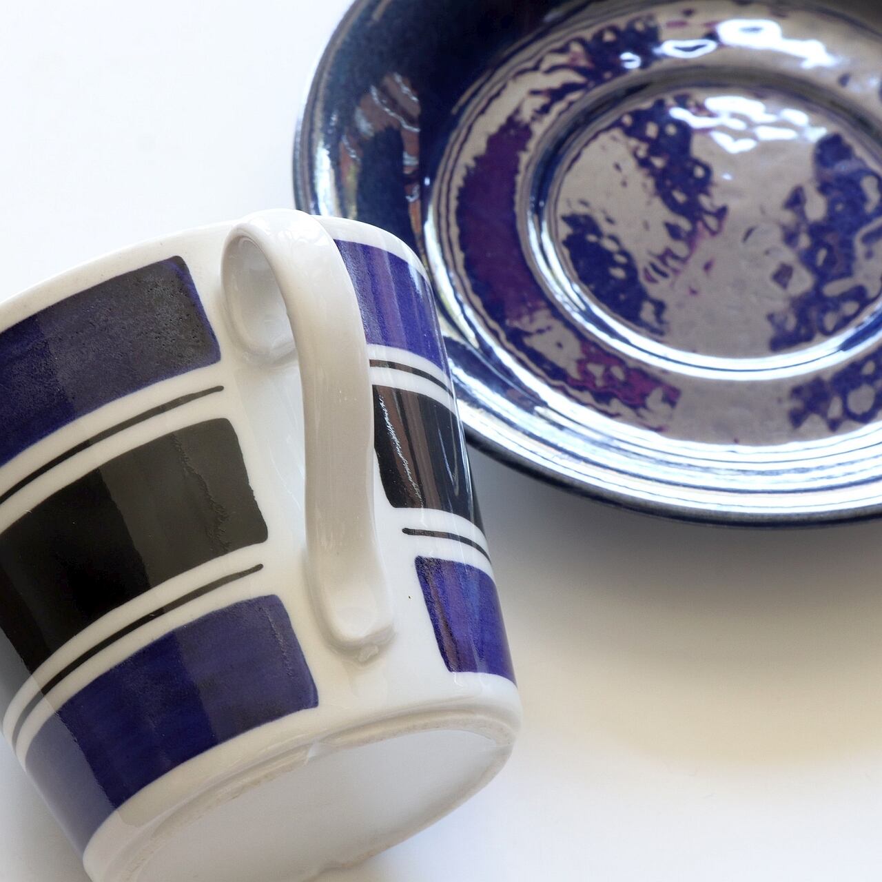 ストライプは手描きで描かれており、それぞれ濃淡やラインの様子は異なります。ソーサーは当時の資料によればカップと同じくストライプの柄が使われているのが中心だったようですが、今回入荷のものは深い青一色のものとなります。バックスタンプが無いため現段階で確定は難しいのですが、別のシリーズを組み合わせた可能性や製造時に通常バージョンとは別バージョンとして作られた可能性があります。