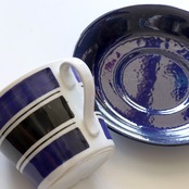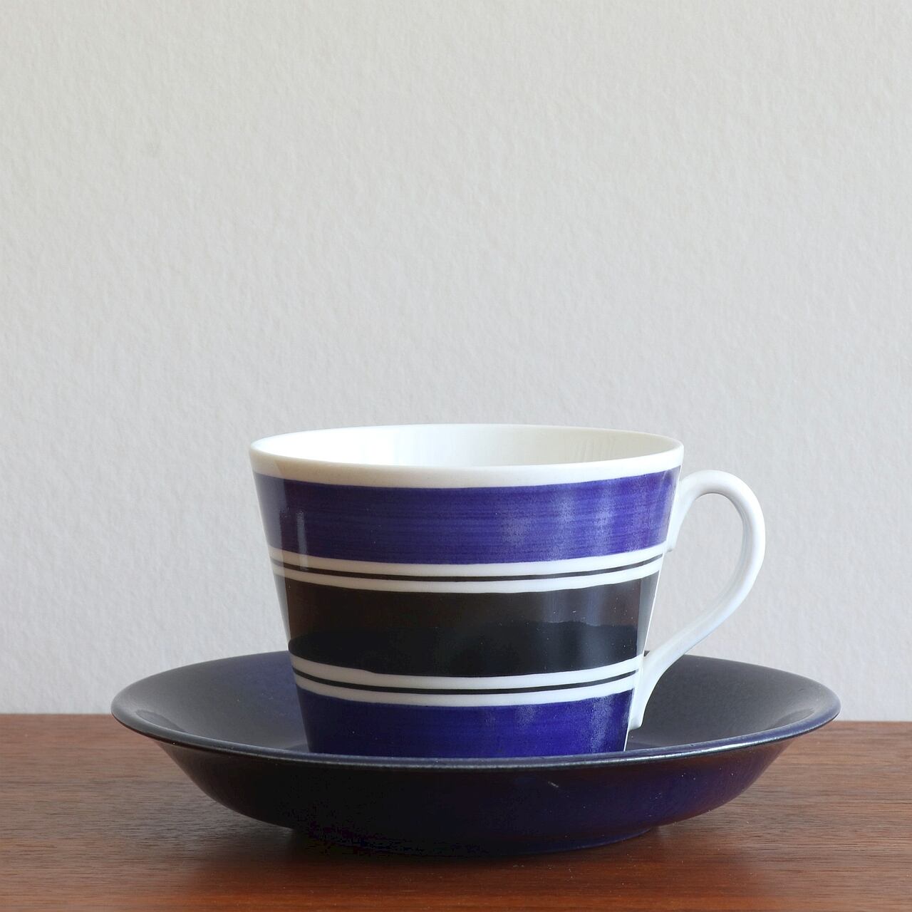ストライプは手描きで描かれており、それぞれ濃淡やラインの様子は異なります。ソーサーは当時の資料によればカップと同じくストライプの柄が使われているのが中心だったようですが、今回入荷のものは深い青一色のものとなります。バックスタンプが無いため現段階で確定は難しいのですが、別のシリーズを組み合わせた可能性や製造時に通常バージョンとは別バージョンとして作られた可能性があります。