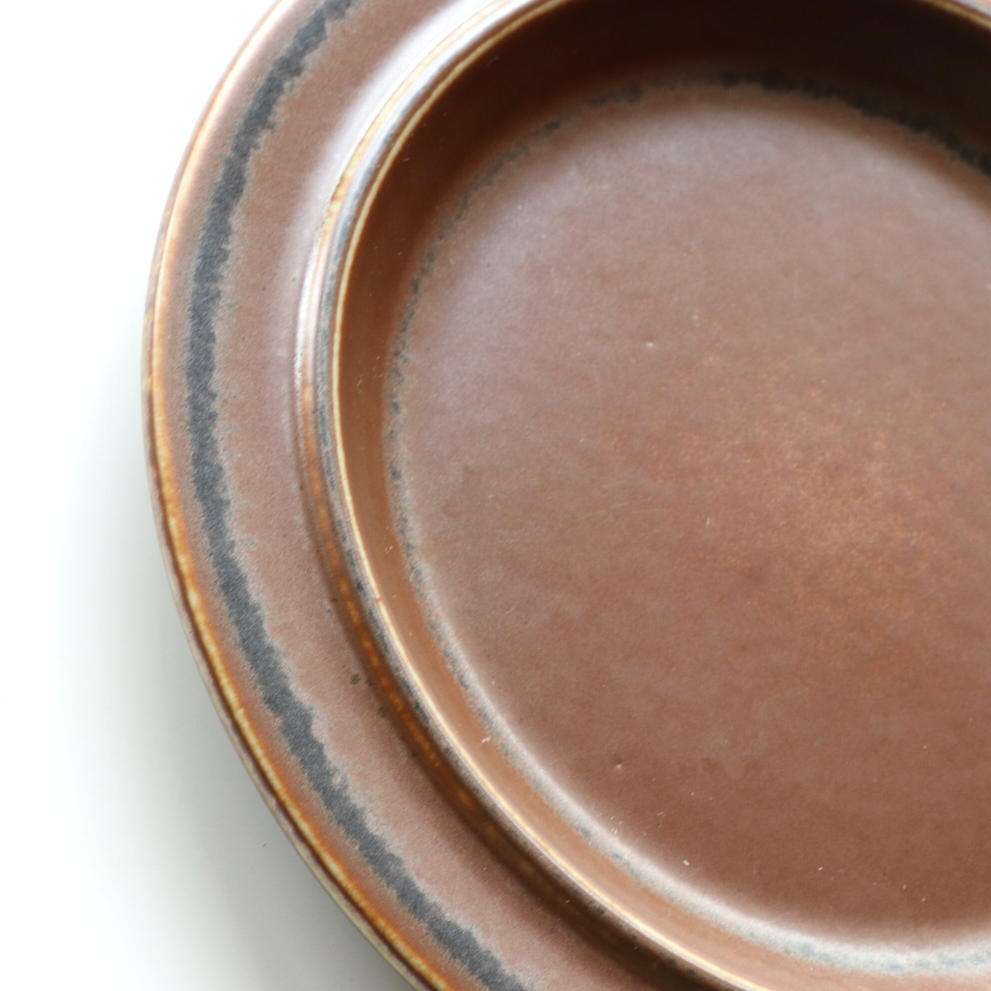 Ruskaは日本語にすると「紅葉」といった意味で、名前のように一つ一つの個体差が大きなシリーズです。ルスカは磁器で成型後、マットなブラウンの釉薬をかけその後に鉄粉を含んだ釉薬をざぶりと塗り付けます。そのため同じシリーズでありながら一点ずつ大きく個体差がうまれ、それぞれが個性的な表情で仕上がることになりました。