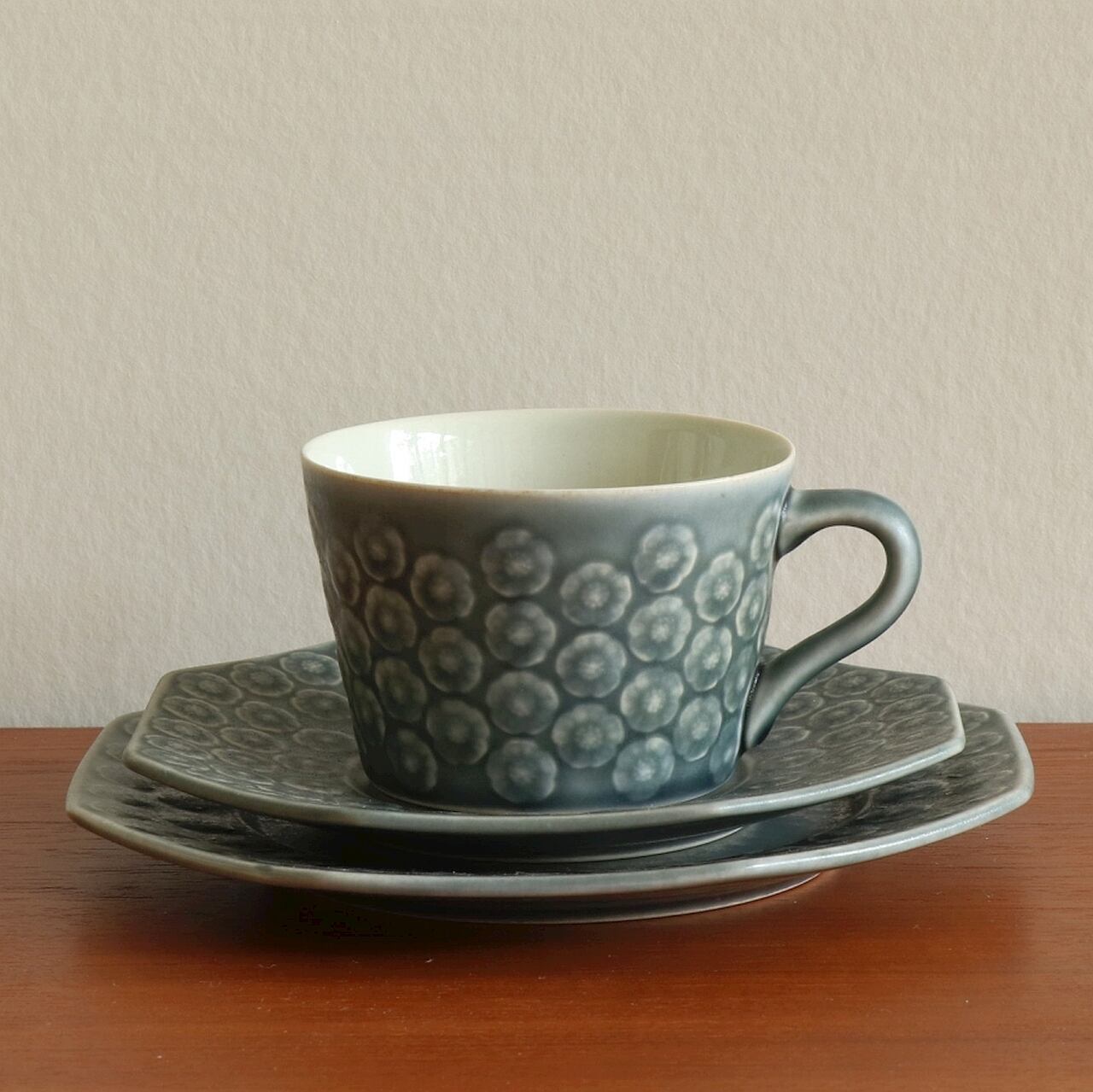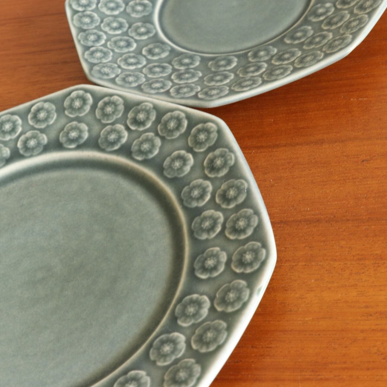 イエンス・クイストゴーデザインによるBlue Azur。 1957年にKronjydenから製作が始まり、その後Nissen・B&Gと製造が続いた人気のシリーズです。 エンボスで表現された杏の花の可愛らしいモチーフでありながら 落ち着いた色合いが甘すぎない柔らかさでとても良い雰囲気です。