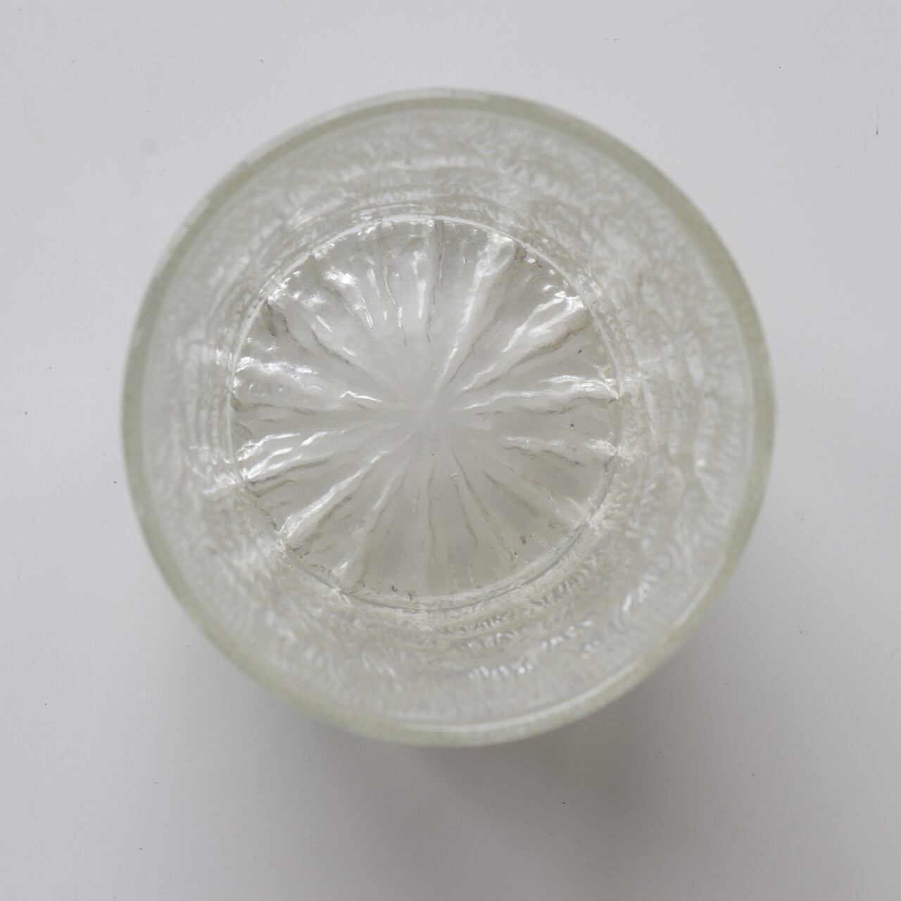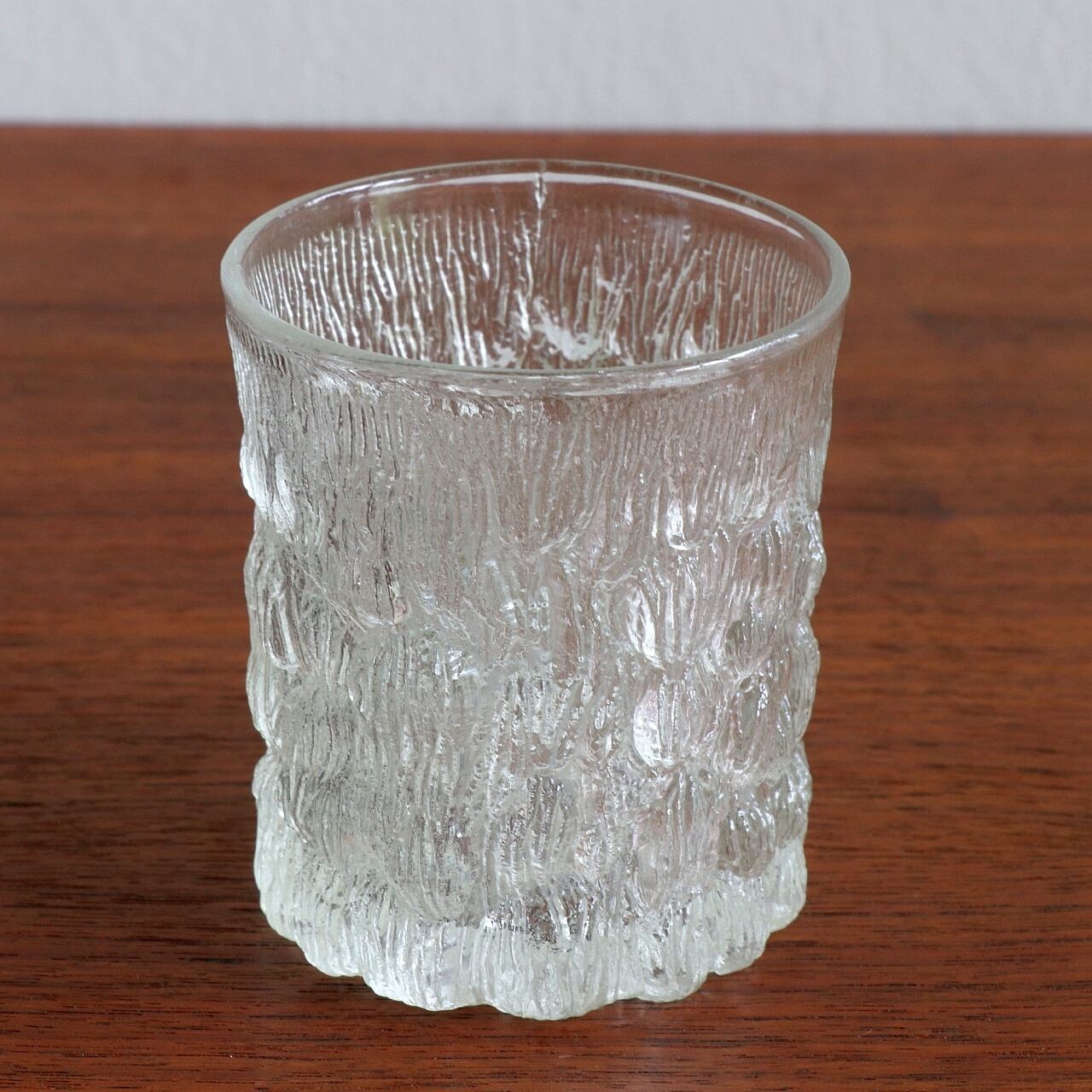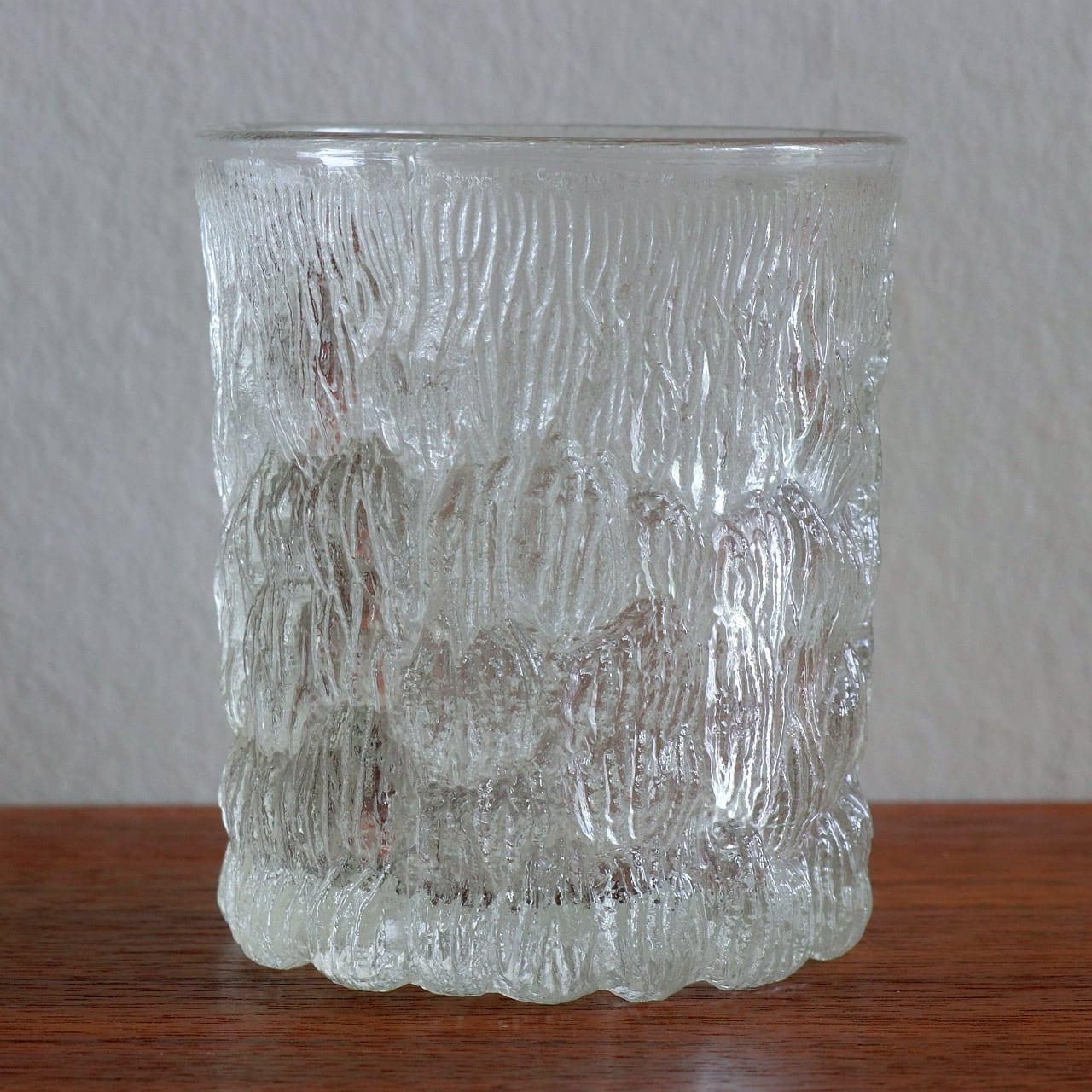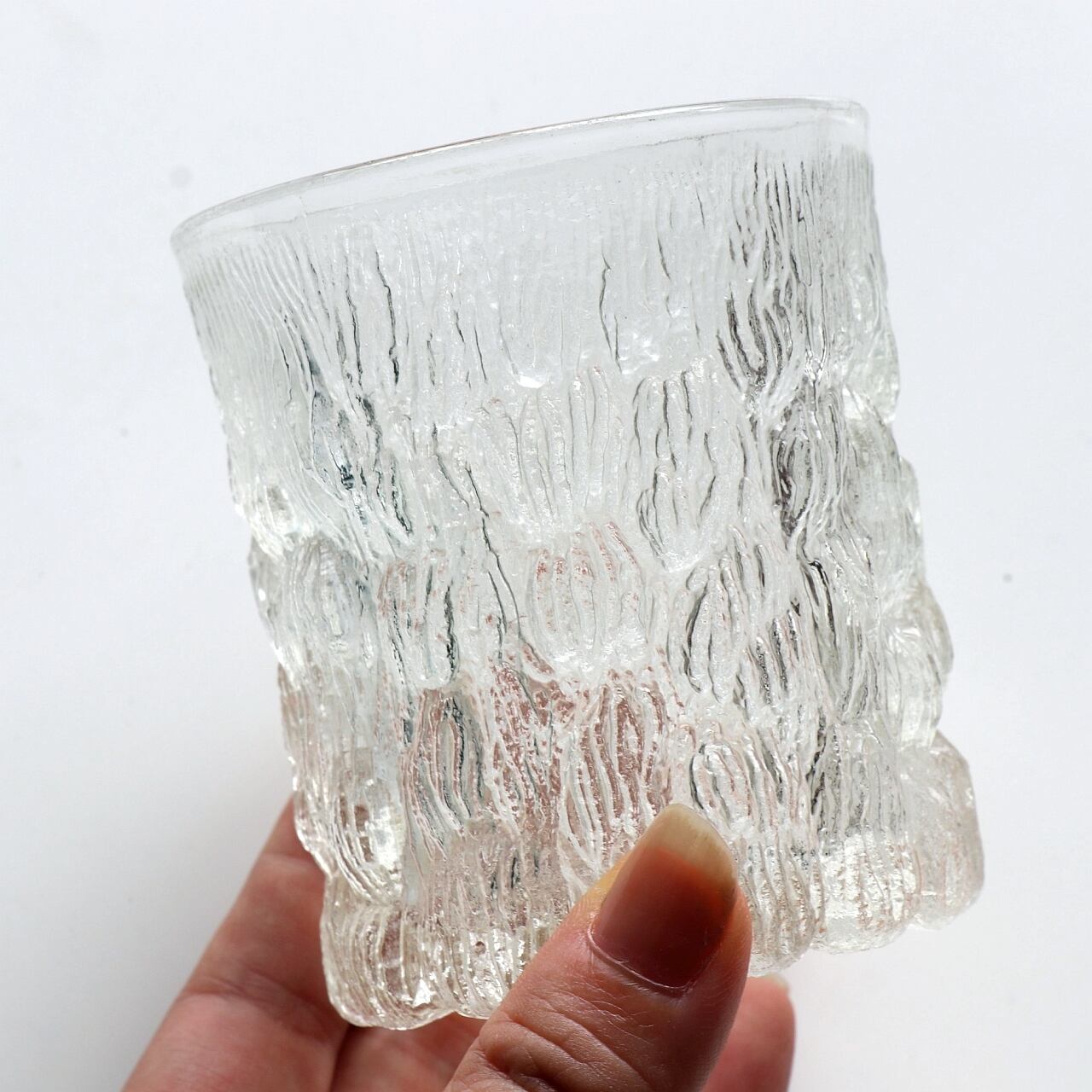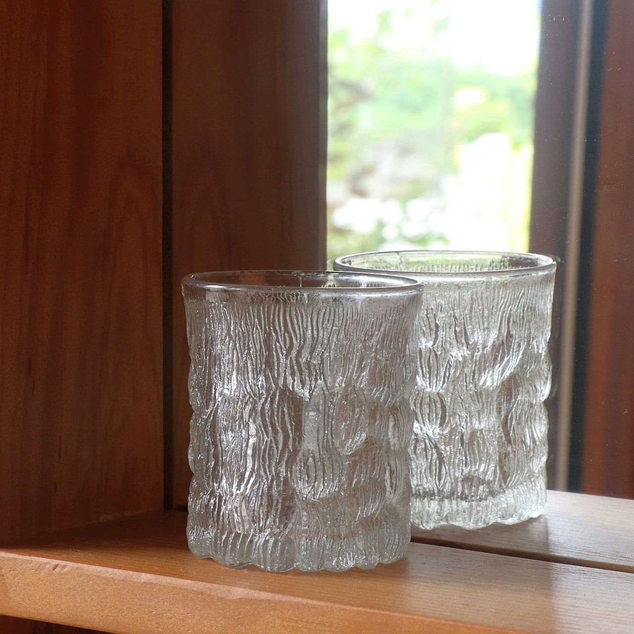 手馴染みの良い小さめのグラスで、プレスガラスで製作されたものとなります。水の流れのような自然な模様でそれだけでも存在感のあるアイテムです。