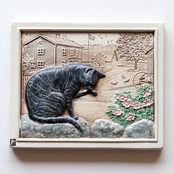 同社の代表的デザイナーStaffan Johnsonによる作品で、街に住むクロネコが描かれた作品です。背面には通し穴と針金が付いていますので、そのまま壁に飾ることも可能です。