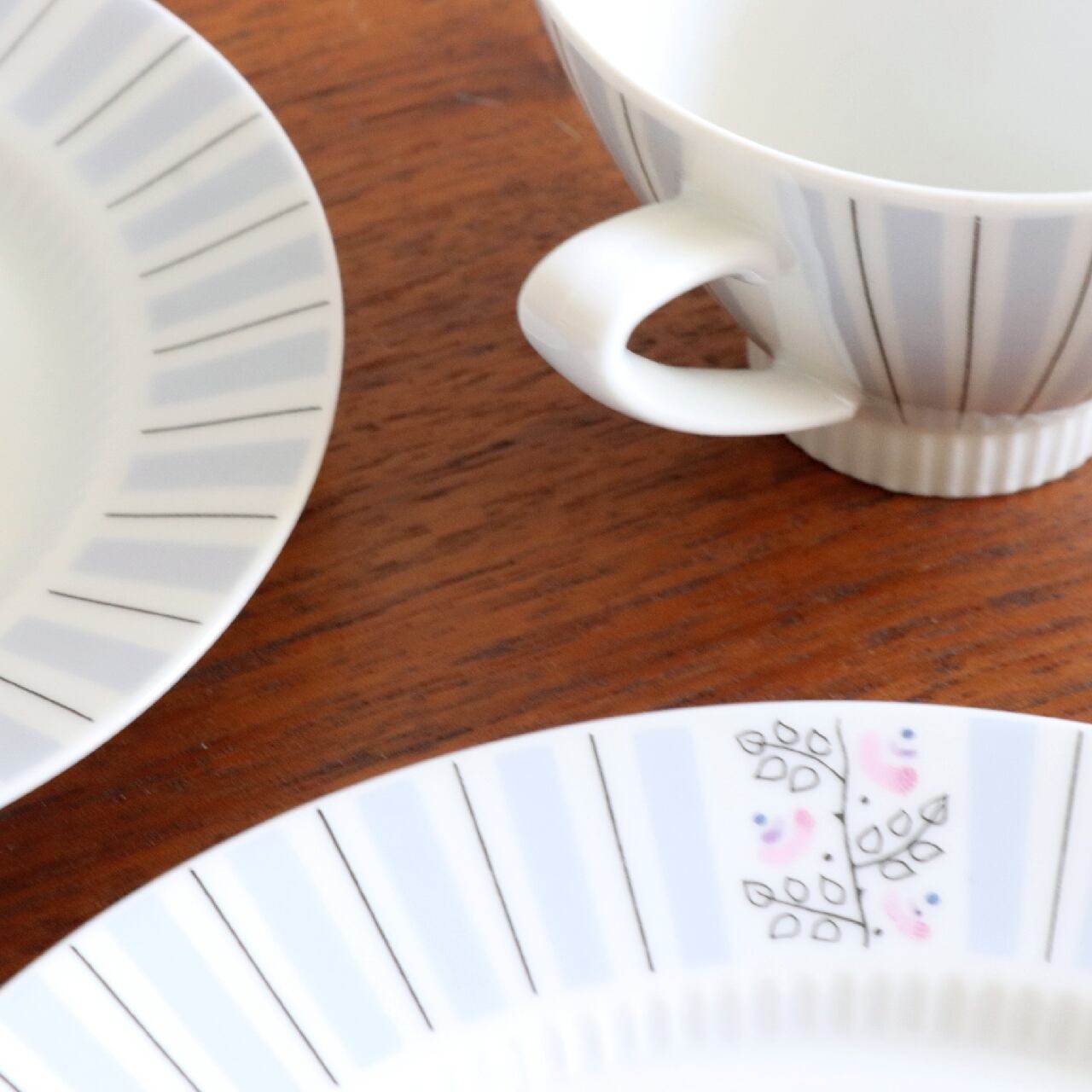 くすみがかったブルーグレーのラインを中心に、ピンクパープルの小花が上品に描かれています。上品さと可愛らしさのバランスも絶妙で、色々なシーンで活用できそうなヴィンテージです。