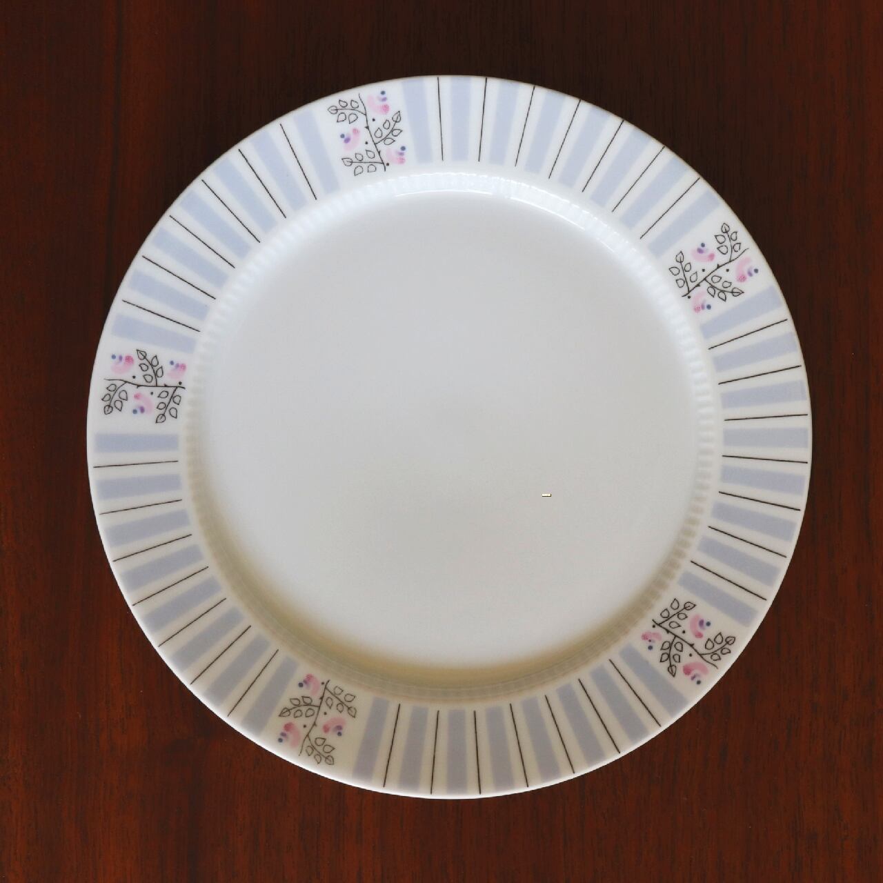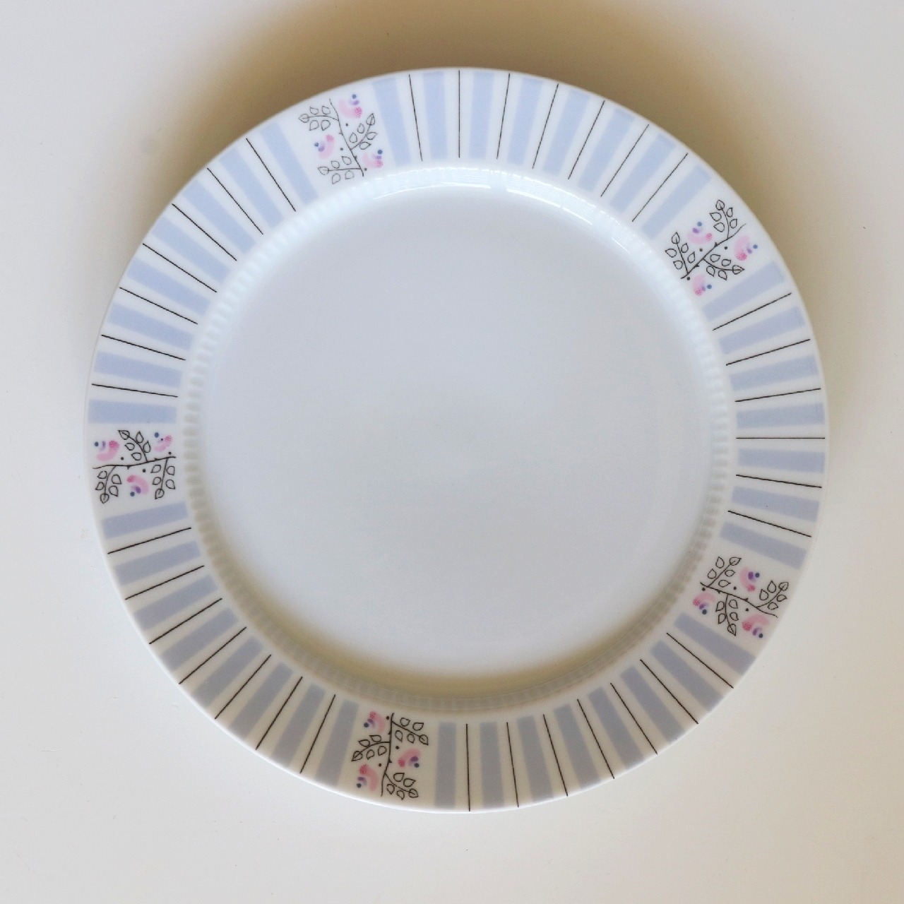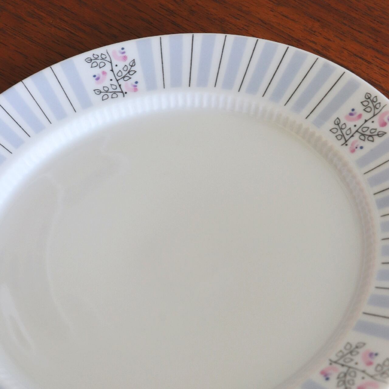 くすみがかったブルーグレーのラインを中心に、ピンクパープルの小花が上品に描かれています。上品さと可愛らしさのバランスも絶妙で、色々なシーンで活用できそうなヴィンテージです。