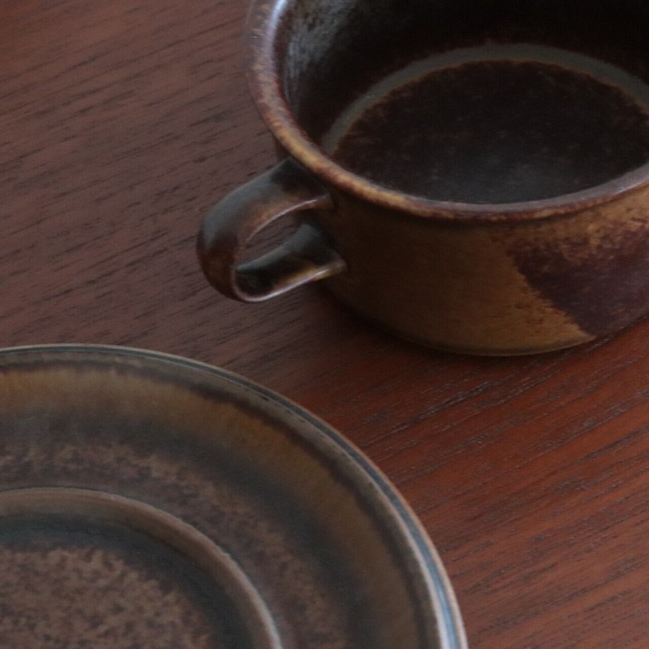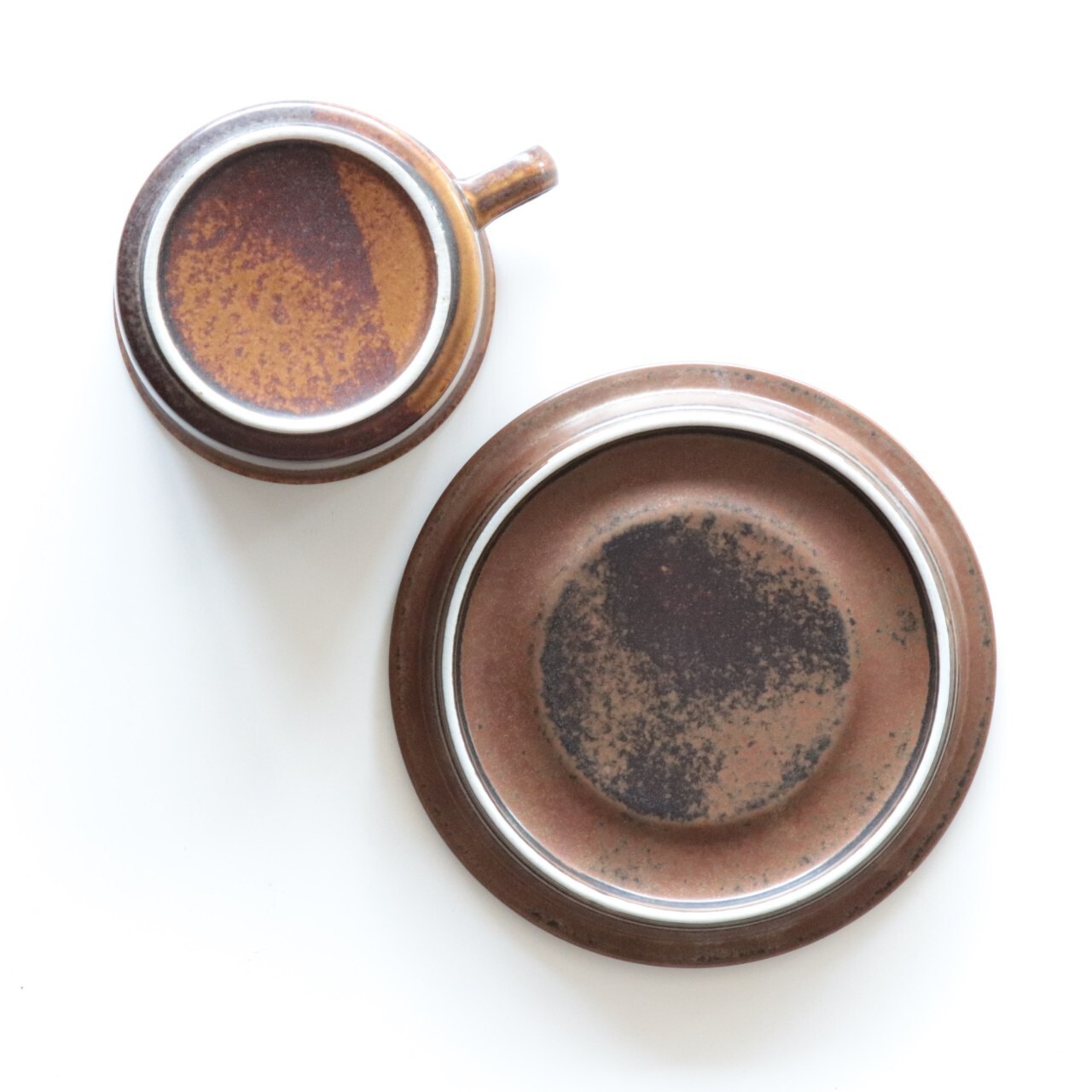 Ruskaは日本語にすると「紅葉」といった意味で、名前のように一つ一つの個体差が大きなシリーズです。ルスカは磁器で成型後、マットなブラウンの釉薬をかけその後に鉄粉を含んだ釉薬をざぶりと塗り付けます。そのため同じシリーズでありながら一点ずつ大きく個体差がうまれ、それぞれが個性的な表情で仕上がることになりました。