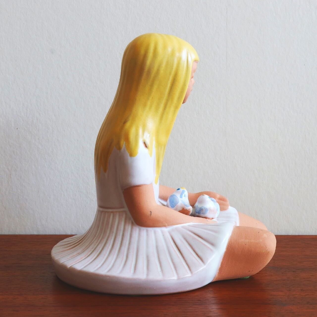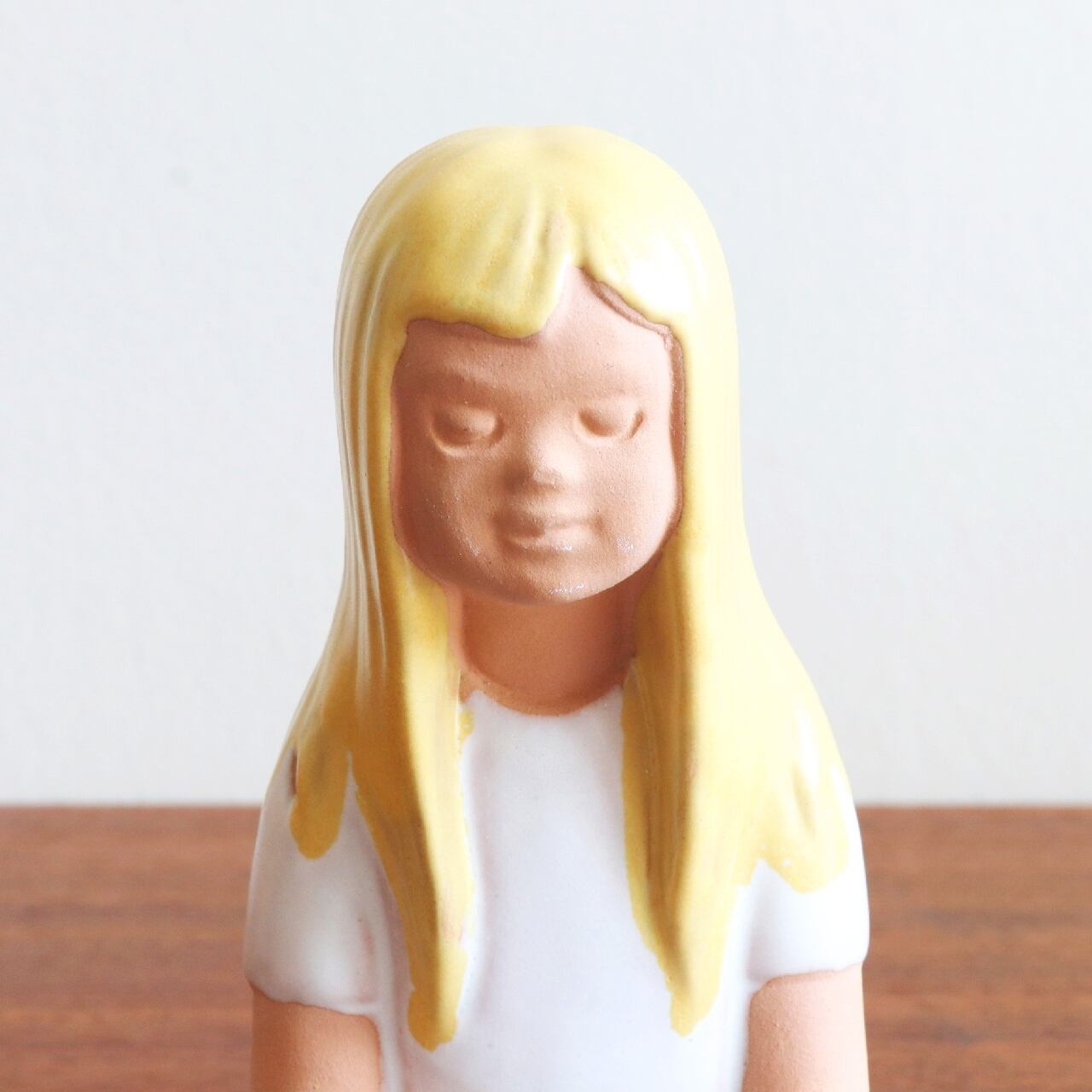 金髪の少女が青と白の鳥を優しく膝に抱えたデザインで、大きさもしっかりとしておりインテリアとして空間を印象付けてくれそうなデザインです。