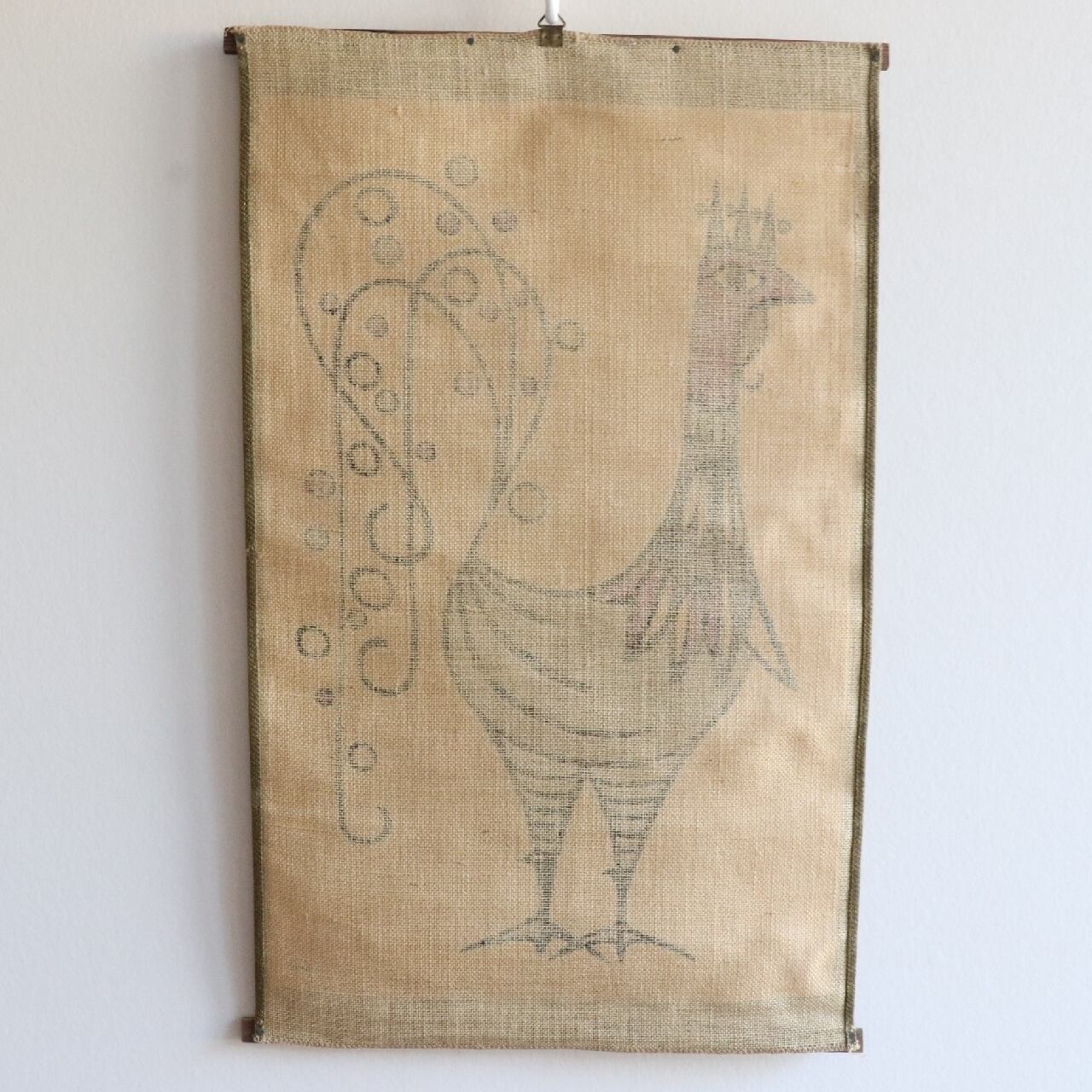 ジュートの布に孔雀を意匠化したような鳥が描かれています。「UHR」という署名がありますが詳細な情報は調べきれませんでした。鳥にはいくつかの色目が製作されたようです。