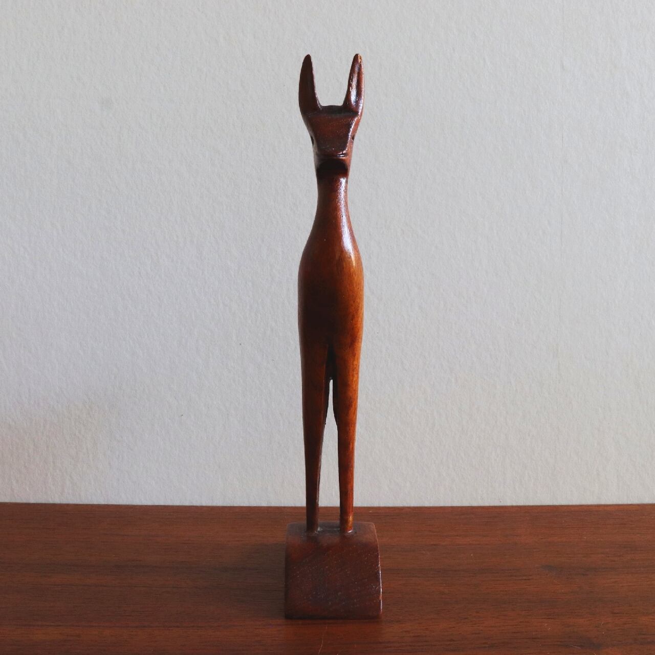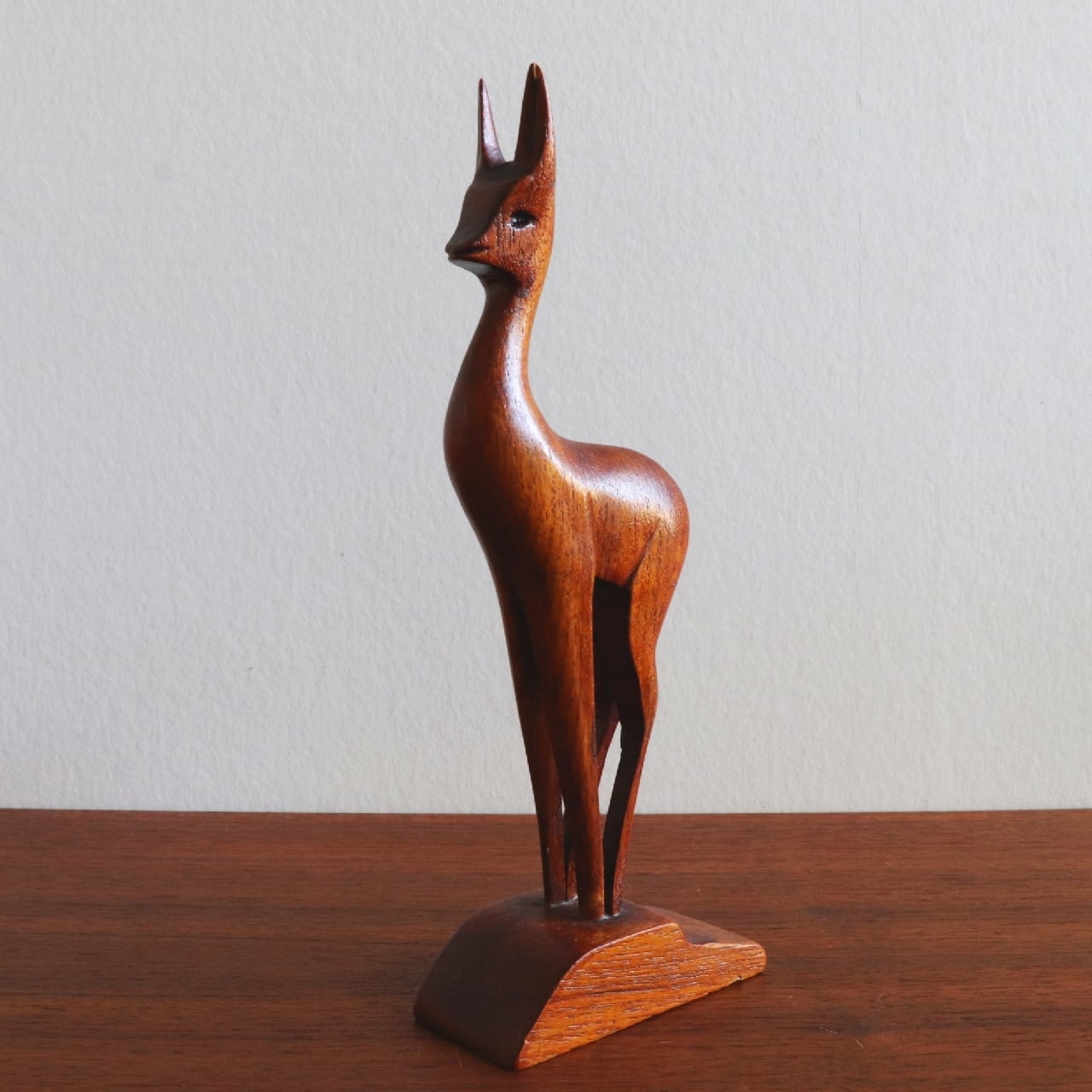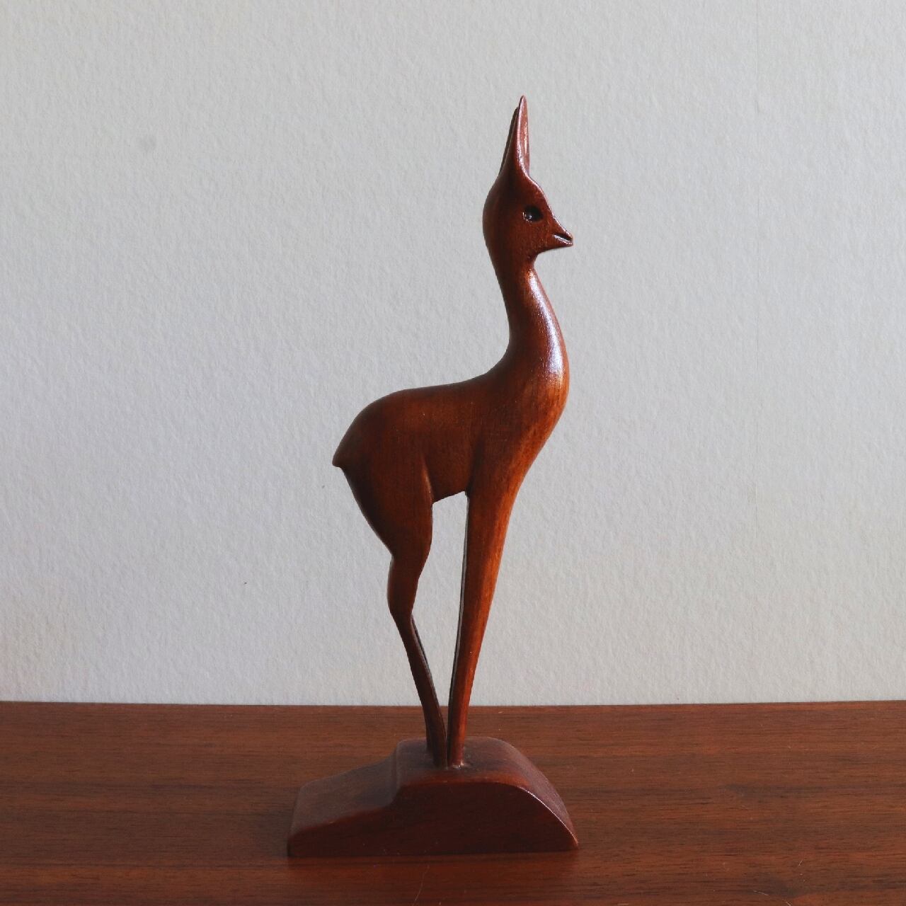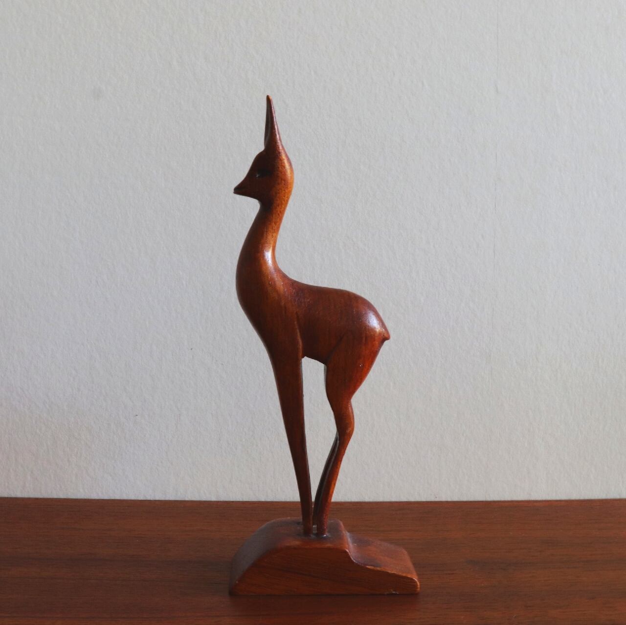 1950-60年代に製作されたチークの鹿のオブジェ。 ミッドセンチュリーではこうした動物のオブジェが非常に人気で、雑誌やテレビ、映画など様々なシーンでインテリアとして空間を彩っていました。 凛とした表情が美しく、飾るだけでお部屋の空気を少し印象深くしてくれそうです。
