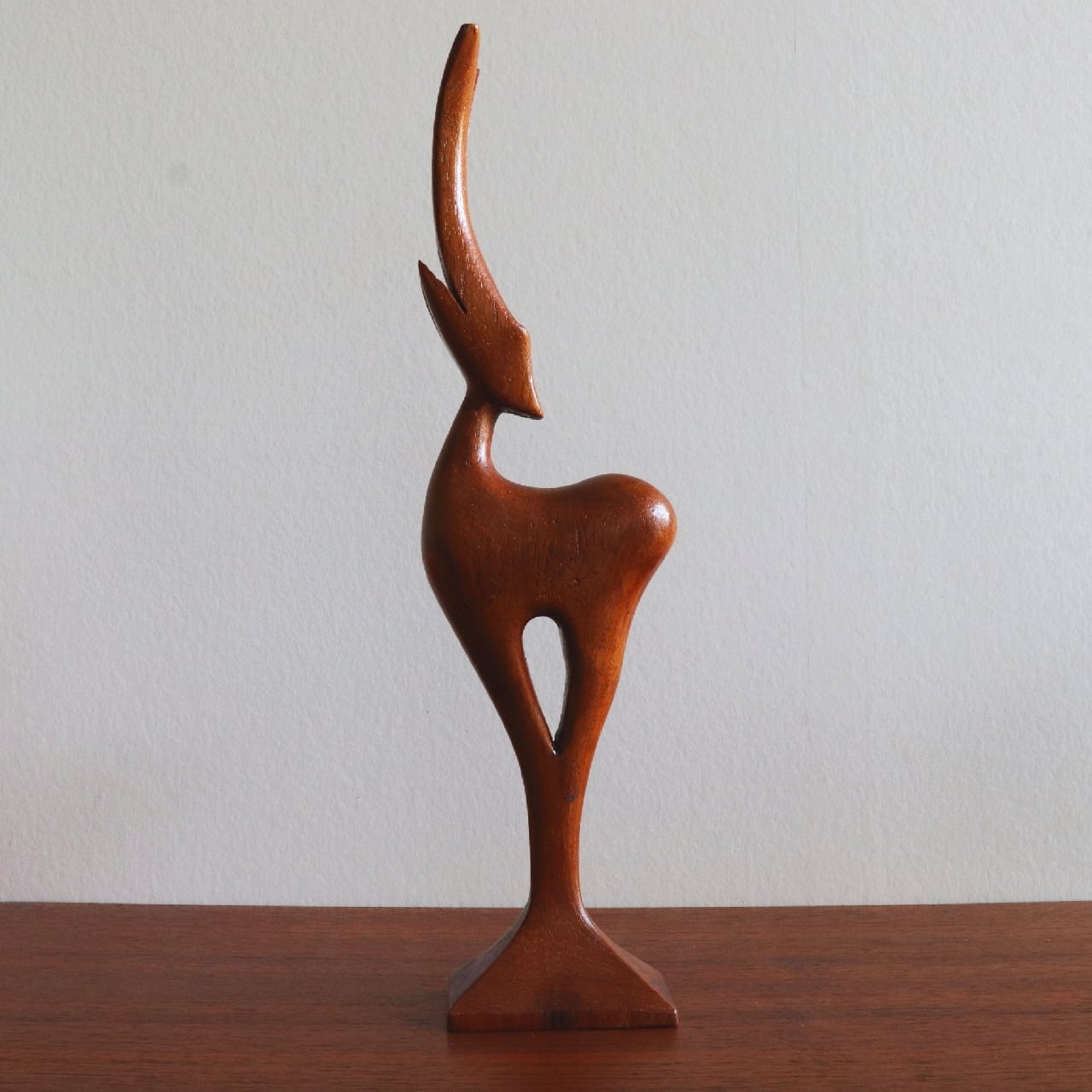 1950-60年代に製作されたチークの鹿のオブジェ。 ミッドセンチュリーではこうした動物のオブジェが非常に人気で、雑誌やテレビ、映画など様々なシーンでインテリアとして空間を彩っていました。 凛とした表情が美しく、飾るだけでお部屋の空気を少し印象深くしてくれそうです。