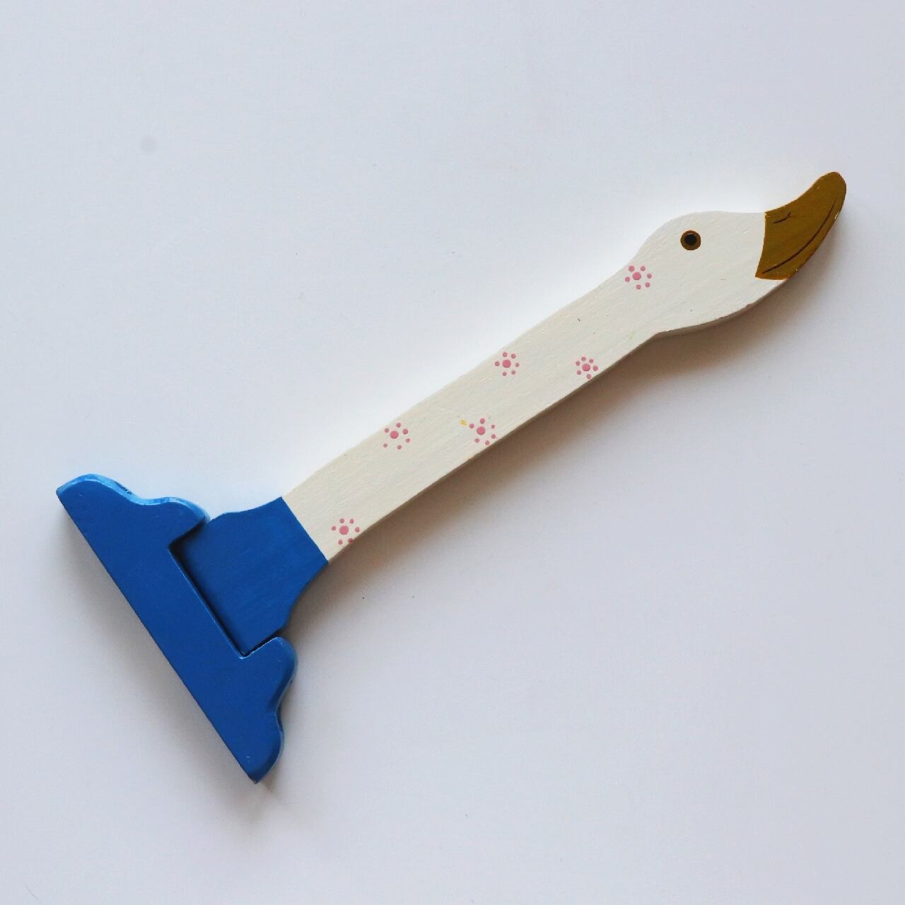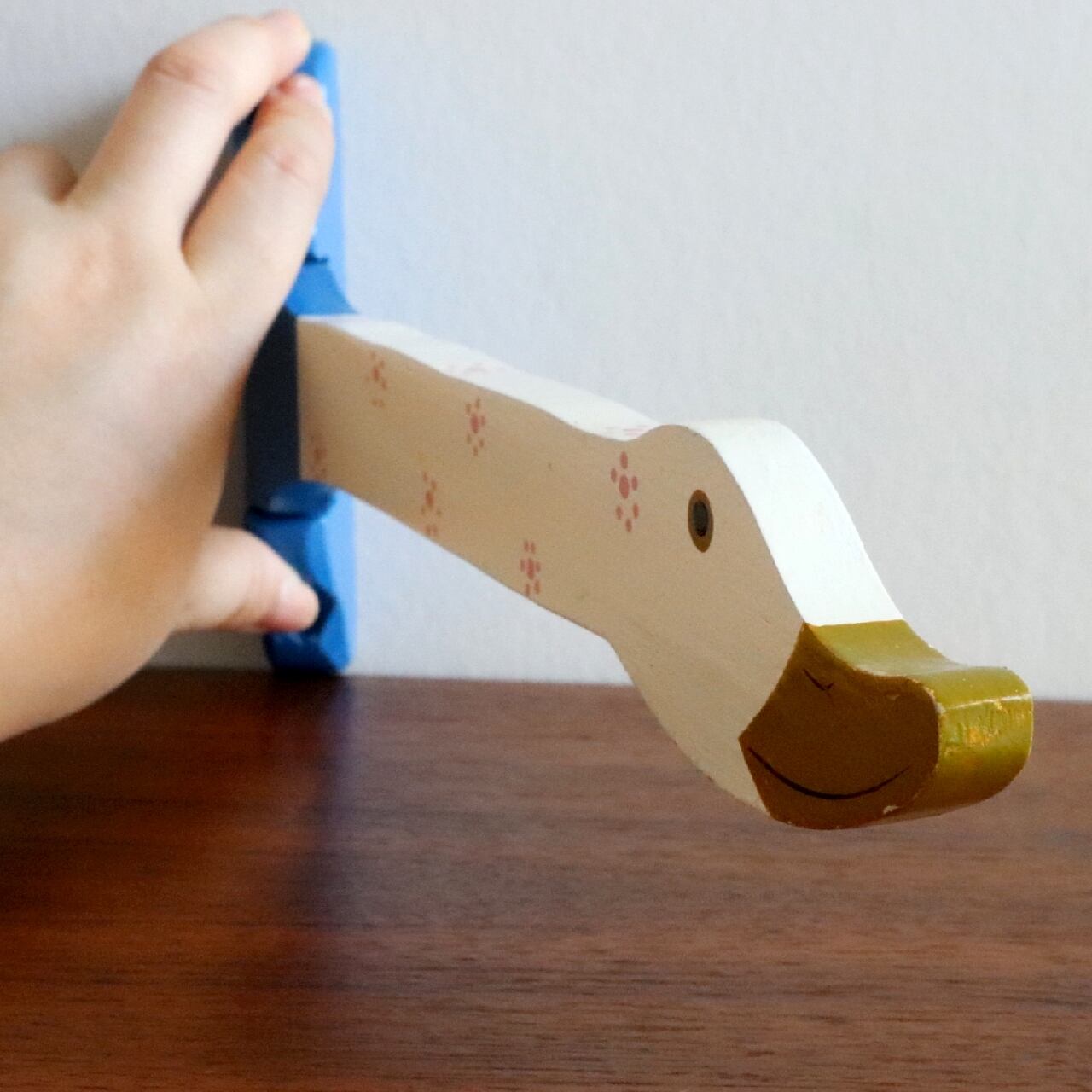 おそらくガチョウ(ニルスのふしぎな旅を意識していそうです)をモチーフにしたもので、可動式となっています。ヴィンテージのため極端に重いものをかけるのには適していませんので、子供服・軽めの服程度の利用でご検討ください。