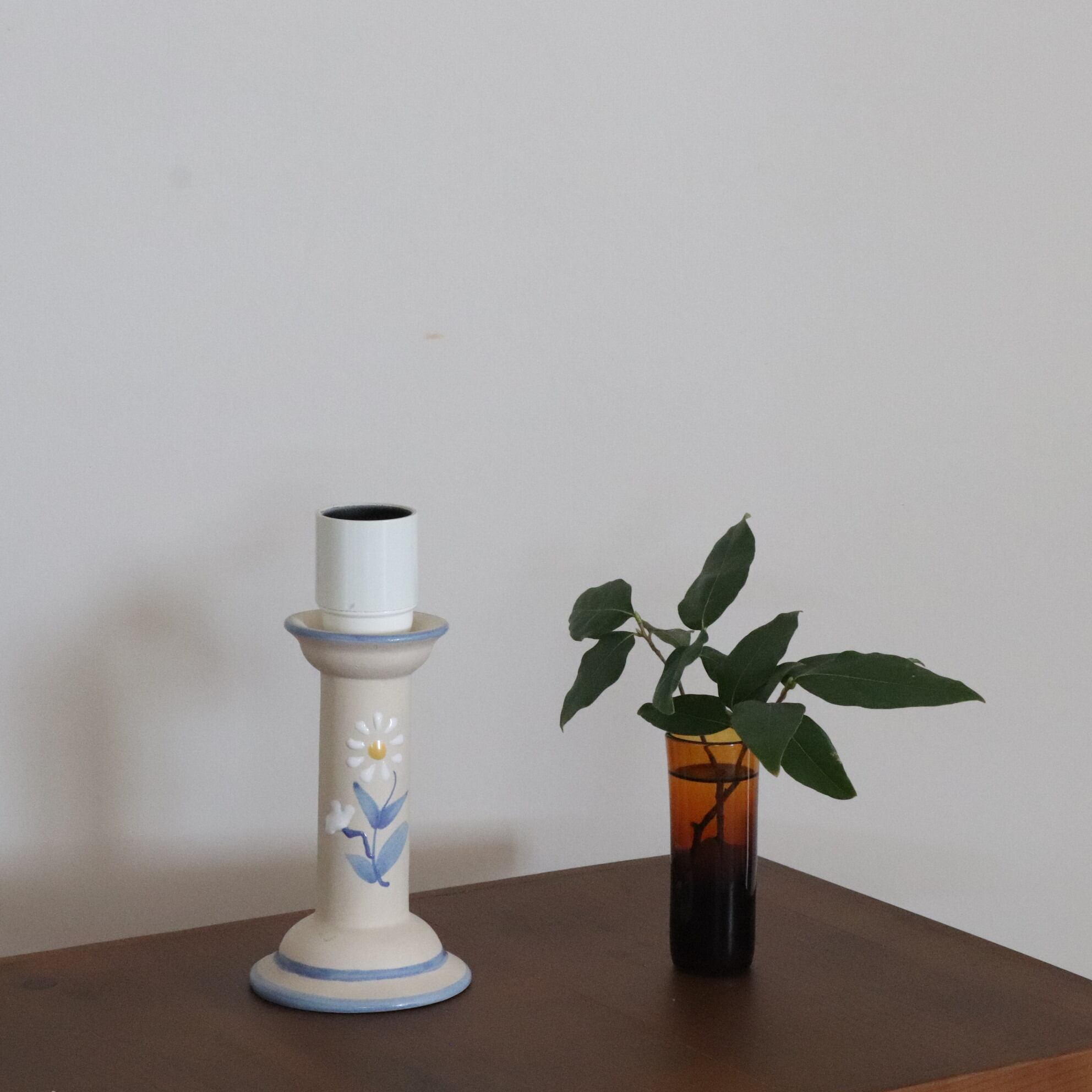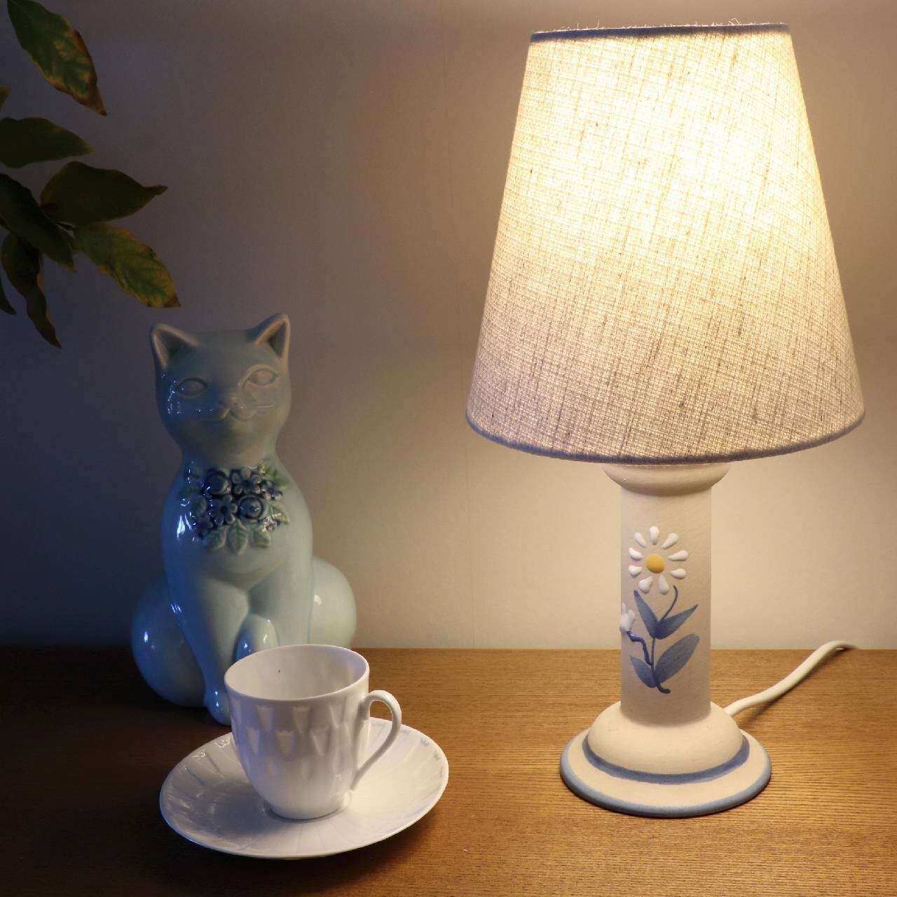 爽やかなミルクホワイトの陶器に、くすんだライトブルーで花の絵が描かれたシンプルながらとても印象が良い照明です。