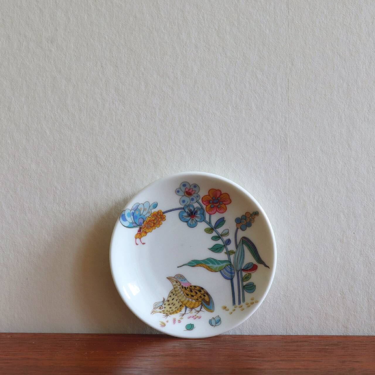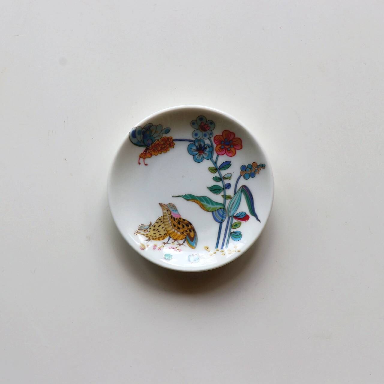 白い磁器に鮮やかな植物、蝶、鳥が描かれています。写実的な絵ではありますが柄は理想的・空想的な色彩でよりデザイン性を高めたカラーリングとなっています。ごく小さな小皿ですが描写は繊細で、高い技術を感じるアイテムです。