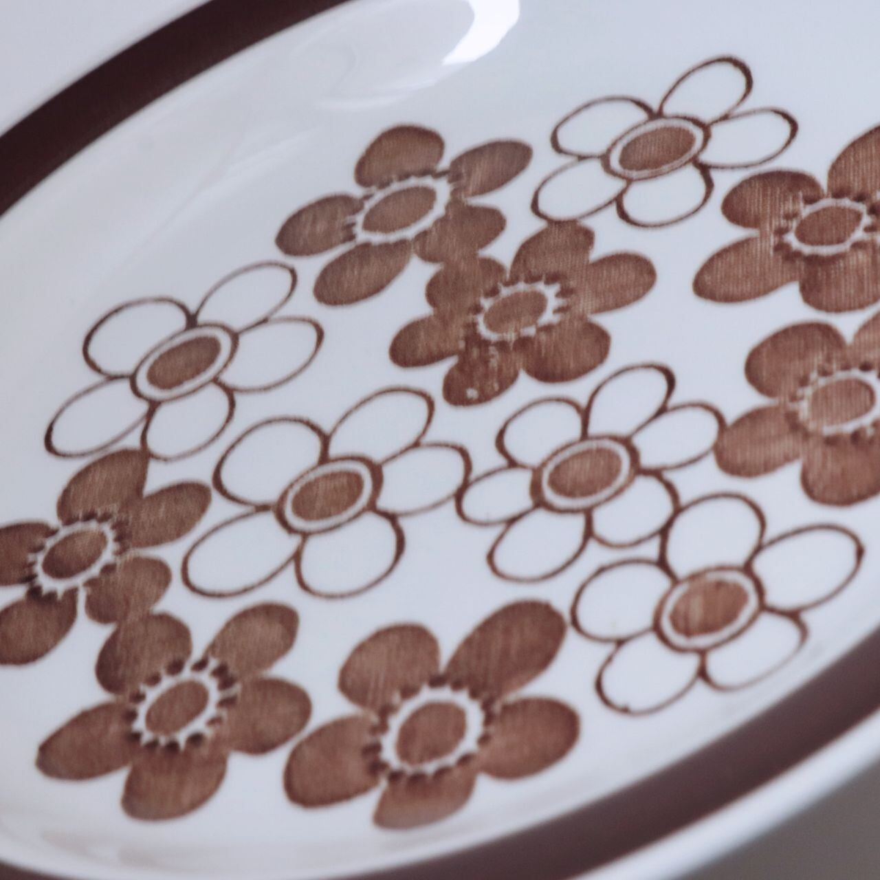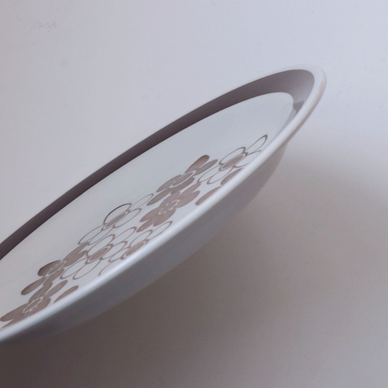 掠れたような独特のテクスチャで描かれた花模様が特徴的です。白地にブラウンが中心ですが、花柄がブルーとなったパターンも製作されています。パターンの花柄はスクリーンプリントで、縁取りやディーププレートの中央部は筆や刷毛で描いたもので、かすれ具合や柄の出方がそれぞれ少しずつ異なっています。同様の仕上げはロールストランド社でも他に例が無く、どの機械を使って仕上げたものかは不明とされている不思議なシリーズです。