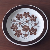 掠れたような独特のテクスチャで描かれた花模様が特徴的です。白地にブラウンが中心ですが、花柄がブルーとなったパターンも製作されています。パターンの花柄はスクリーンプリントで、縁取りやディーププレートの中央部は筆や刷毛で描いたもので、かすれ具合や柄の出方がそれぞれ少しずつ異なっています。同様の仕上げはロールストランド社でも他に例が無く、どの機械を使って仕上げたものかは不明とされている不思議なシリーズです。