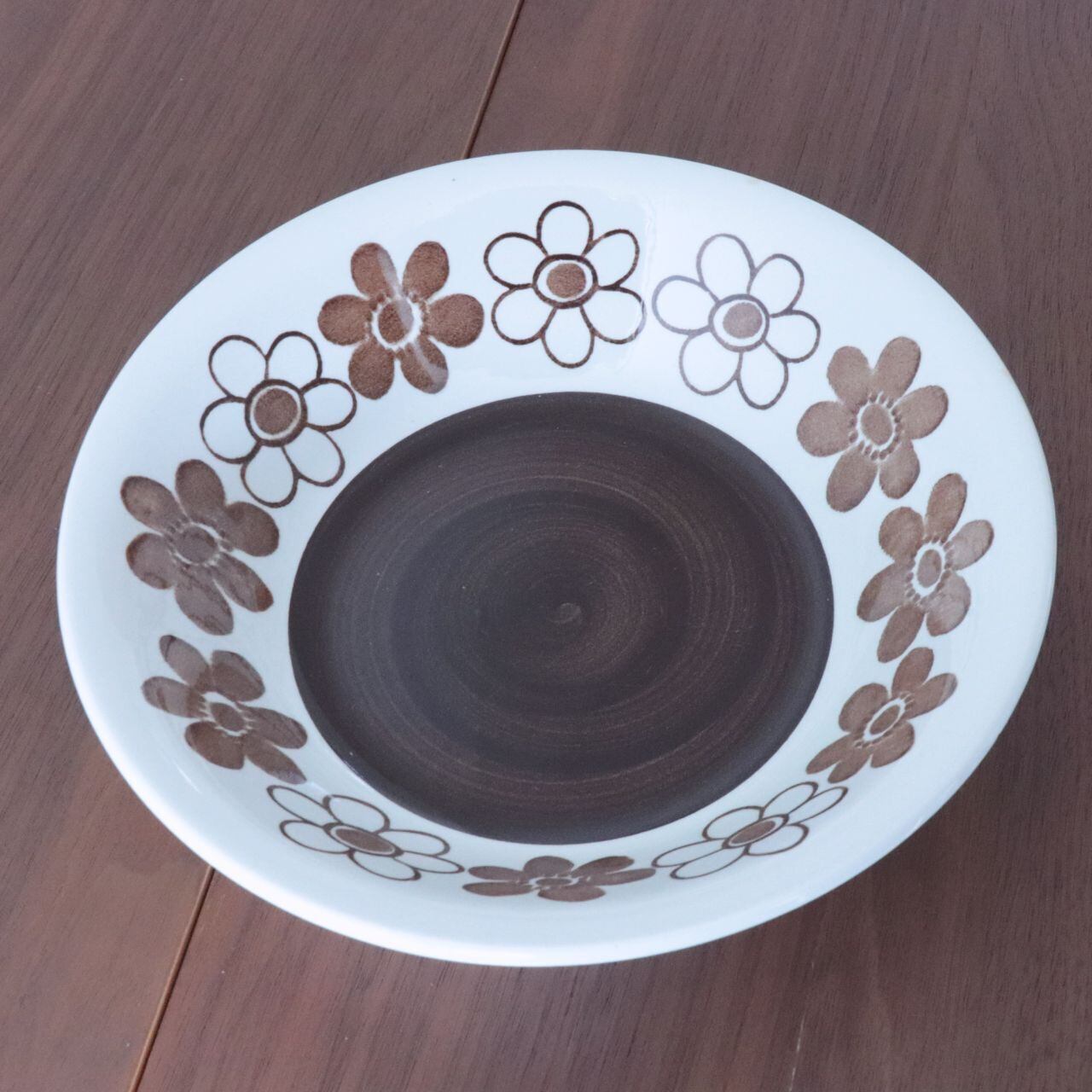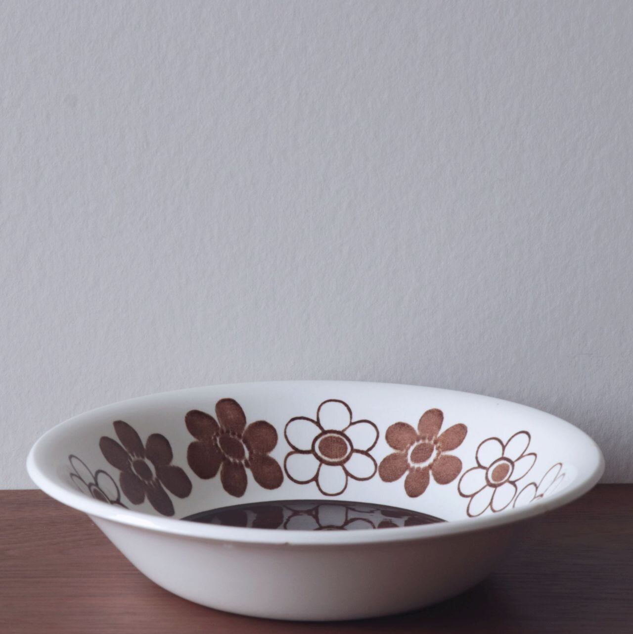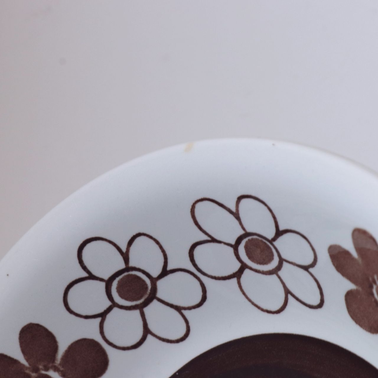 掠れたような独特のテクスチャで描かれた花模様が特徴的です。白地にブラウンが中心ですが、花柄がブルーとなったパターンも製作されています。パターンの花柄はスクリーンプリントで、縁取りやディーププレートの中央部は筆や刷毛で描いたもので、かすれ具合や柄の出方がそれぞれ少しずつ異なっています。同様の仕上げはロールストランド社でも他に例が無く、どの機械を使って仕上げたものかは不明とされている不思議なシリーズです。
