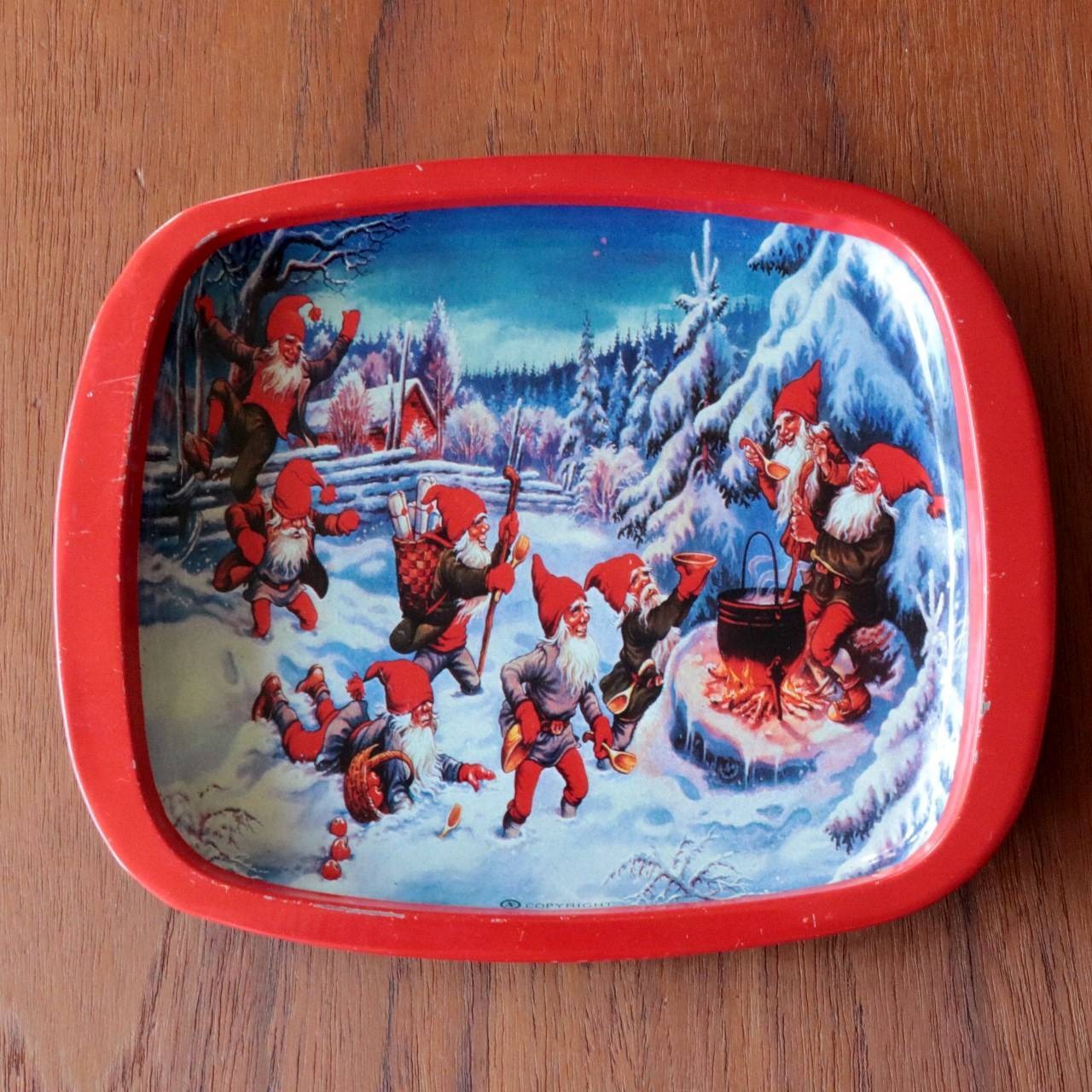 雪の中トムテたちがクリスマスの準備をする、レトロで可愛い柄。トムテたちはこの時代らしくリアルな表情で、活気あふれる雰囲気もまた味わい深いアイテムです。