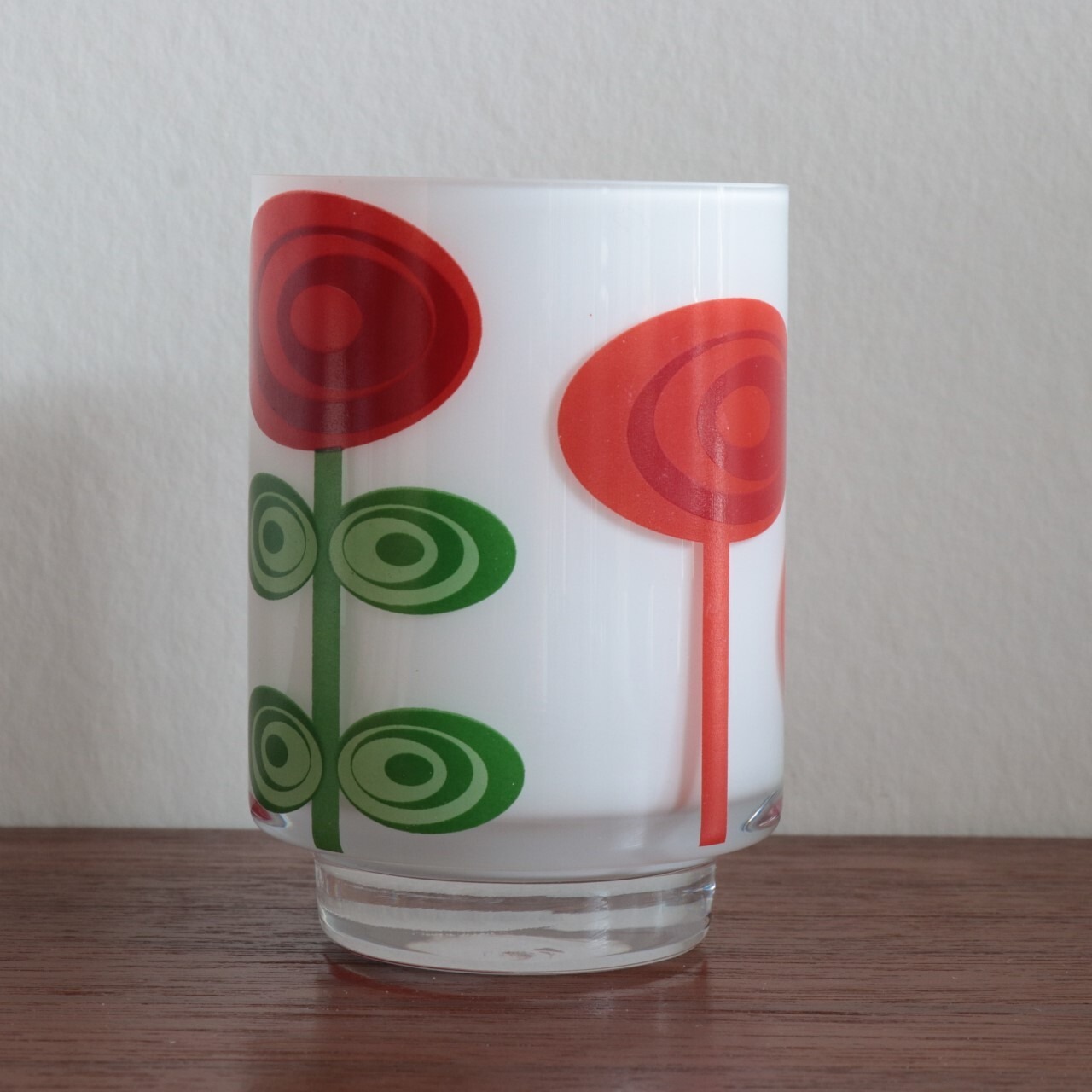 ミルキーホワイトのガラスに、ミッドセンチュリーらしいポップなテイストの花柄が描かれた作品。キャンドルを灯すと優しく色が透け、なんとも幻想的な雰囲気です。