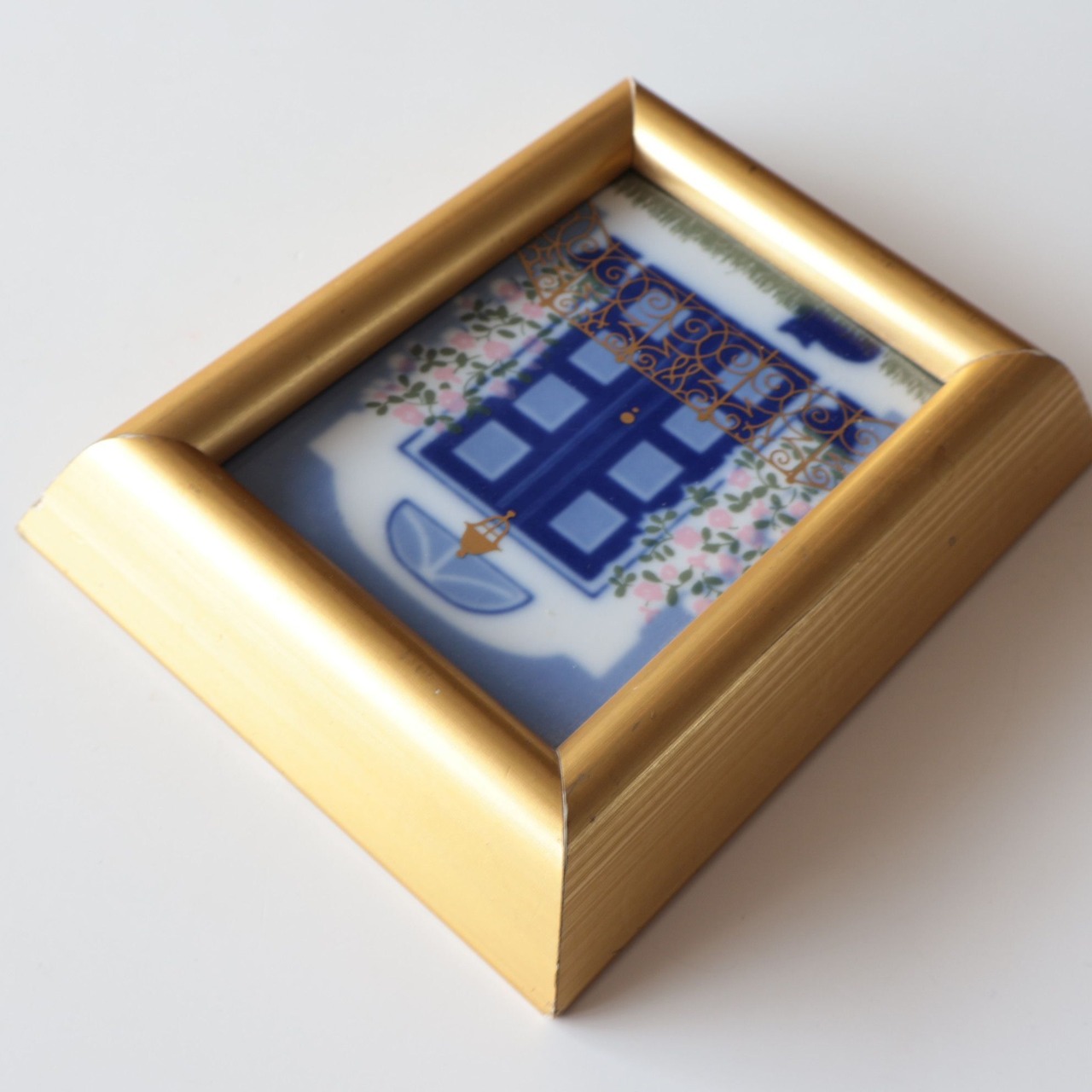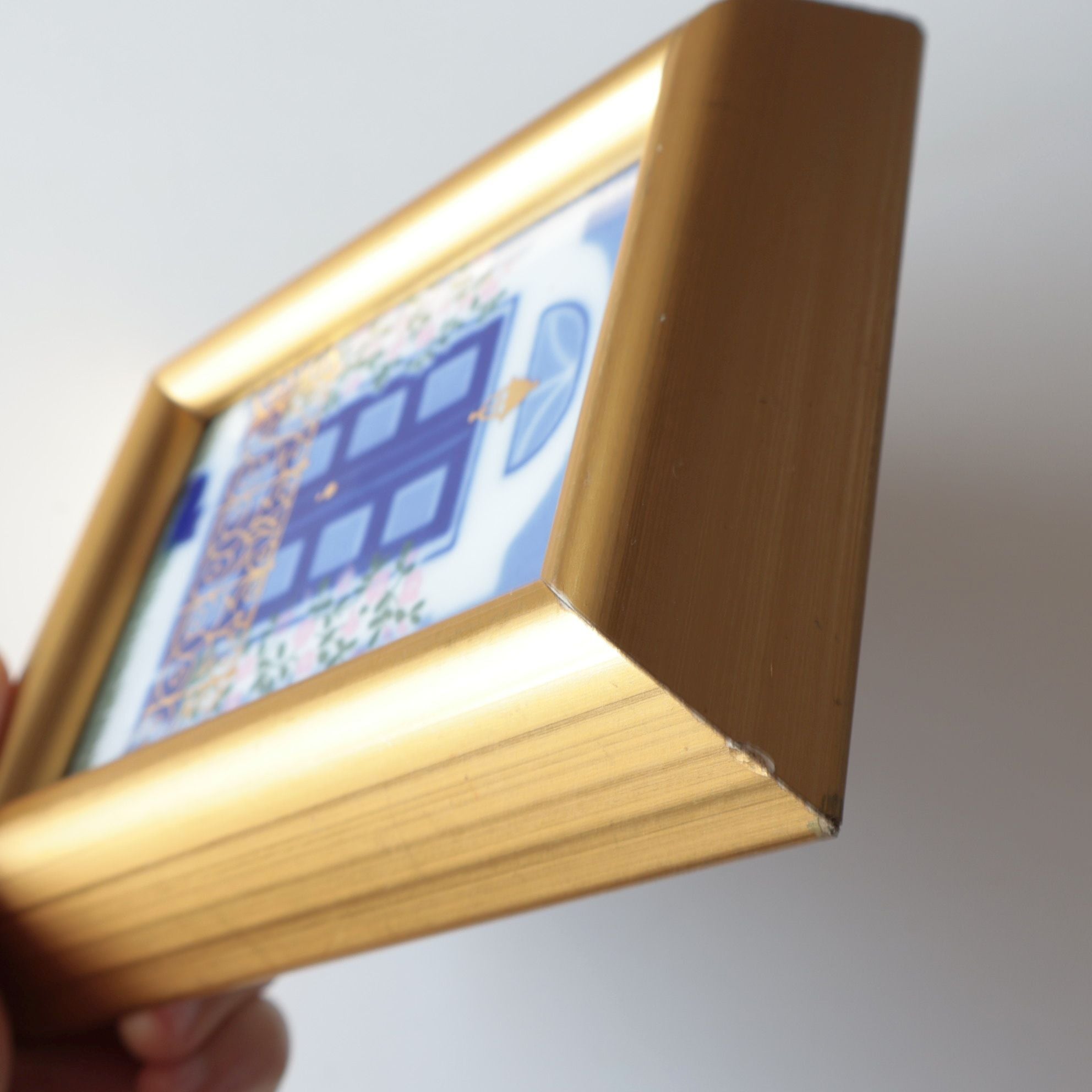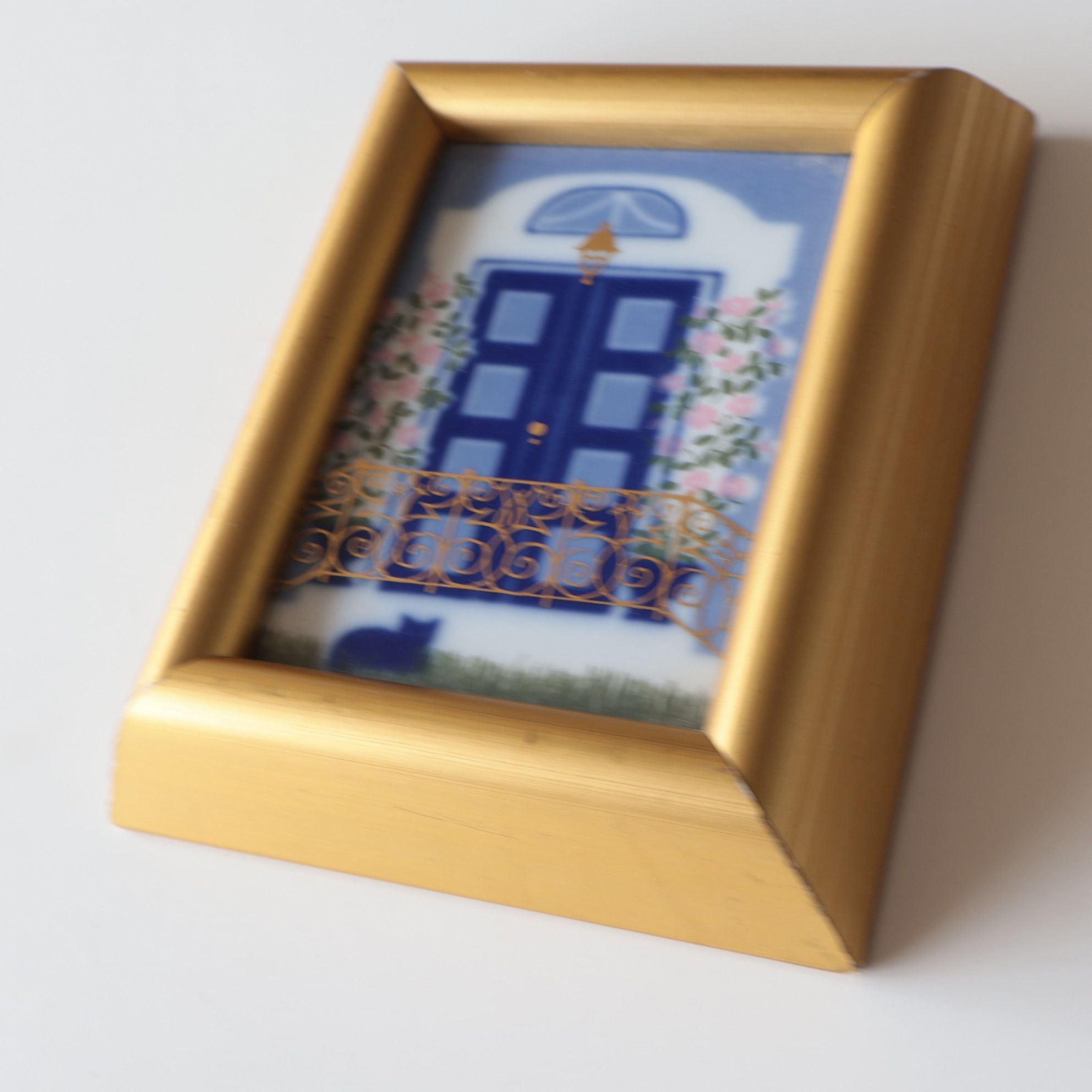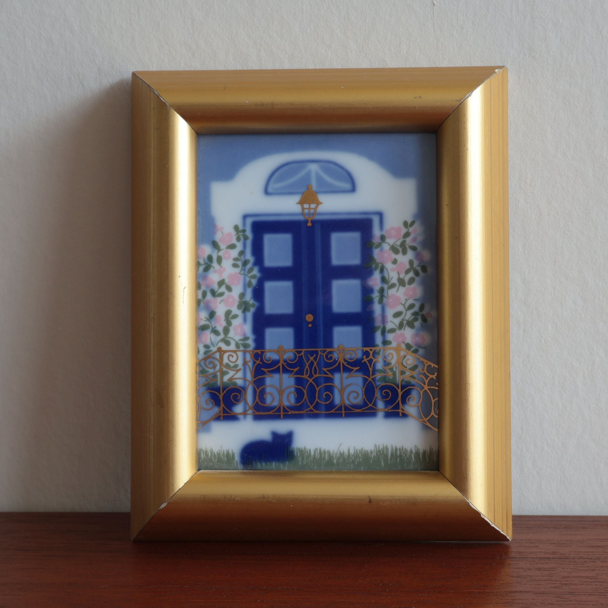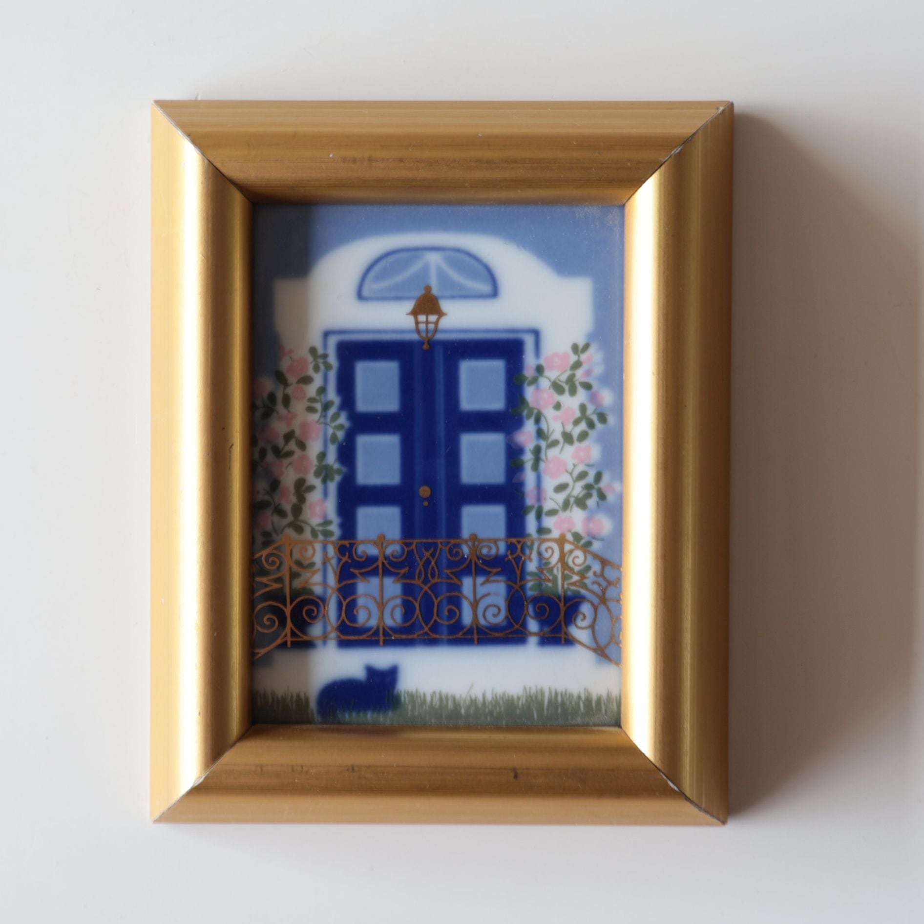 窓の下に横たわる猫。時期は春から初夏にかけてでしょうか、青色をベースに彩色された上品なデザインです。中央は陶板、枠は木に金色の彩色がされています。木部の一部に経年によるダメージが見られます。壁掛けが出来るよう、背面に金具が付いています。