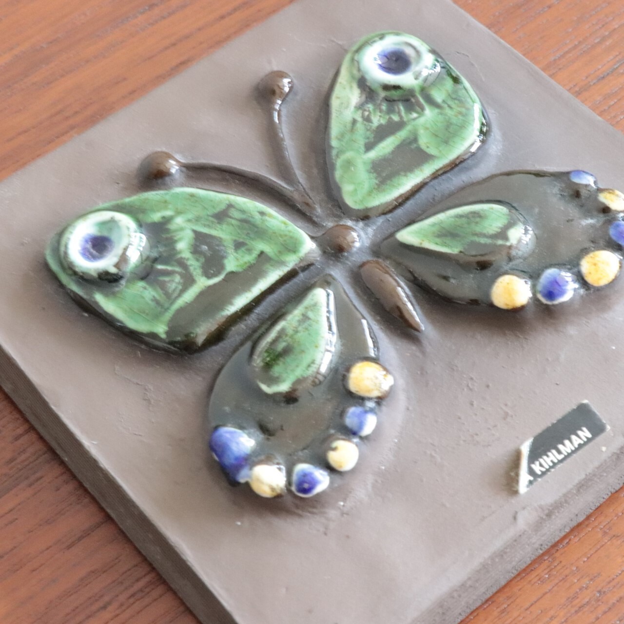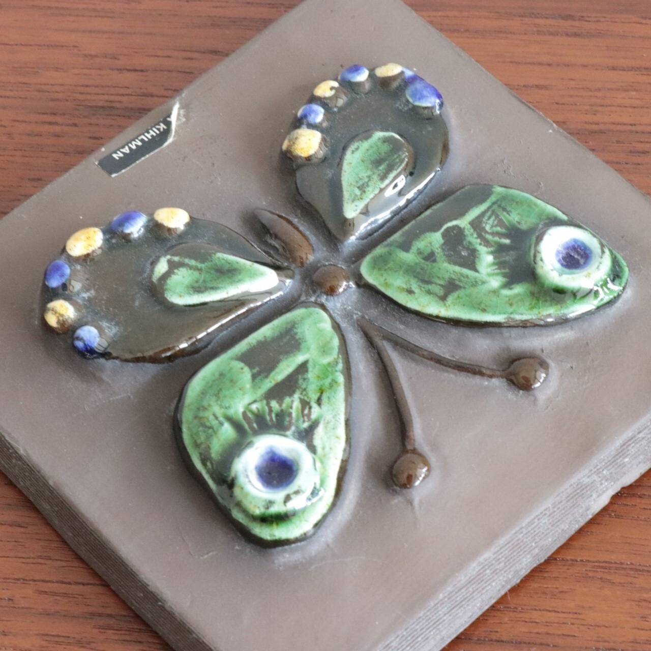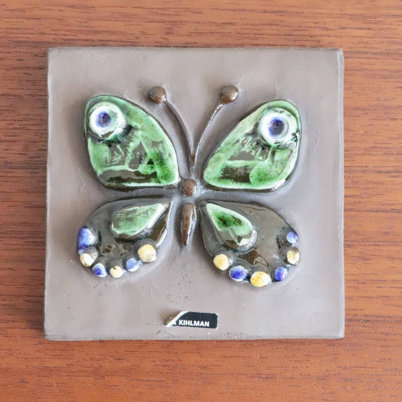 Annika Kihlman による作品で、特徴的な柄の蝶々が描かれています。蝶の陶板はいくつか異なる柄や、二羽・三羽とサイズが異なるものでも製作されています。背面には通し穴と針金が付いていますので、そのまま壁に飾ることも可能です。