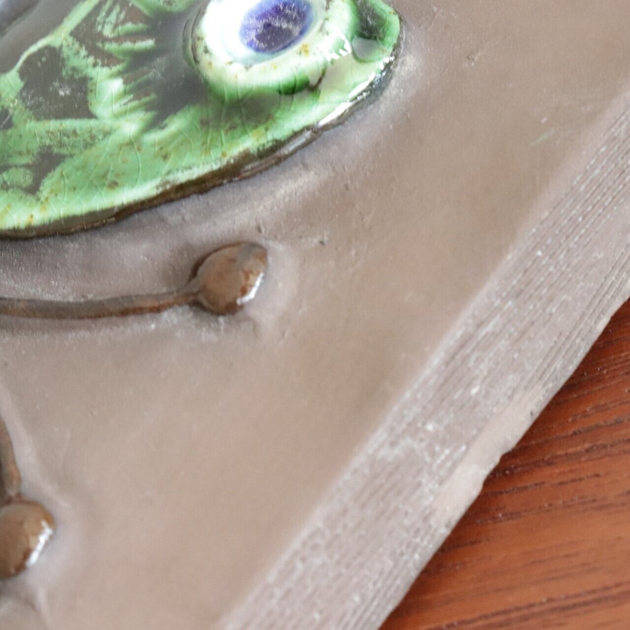 同社陶板の特徴として、製造時にコテやヘラによる成型時の凹凸、焼成時の釉薬抜け・色とび、また製造後の小さな欠けなどが比較的おきやすいアイテムとなります。また同じモチーフの製品でも製造時の個体差により若干のサイズ差が見られる工房となります。