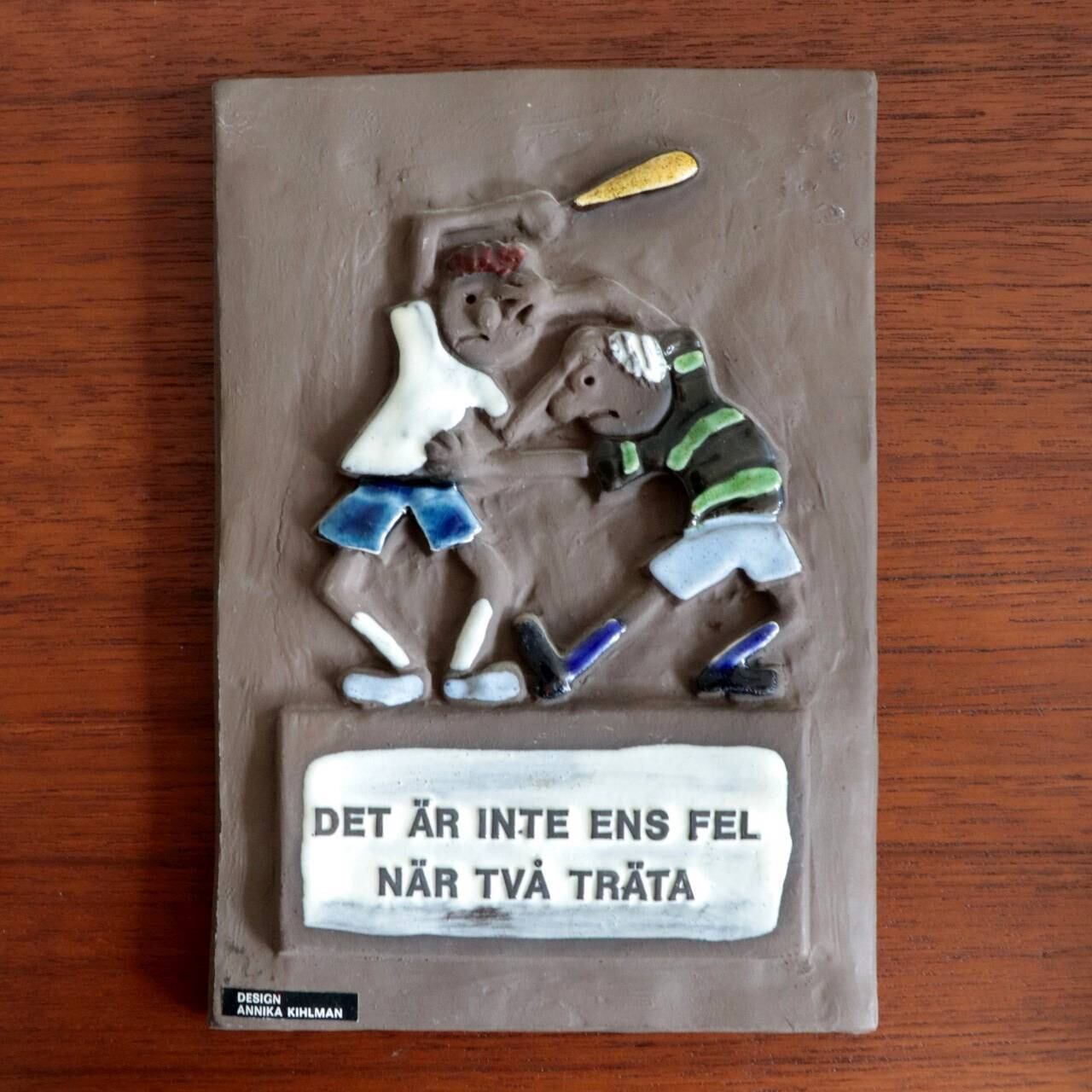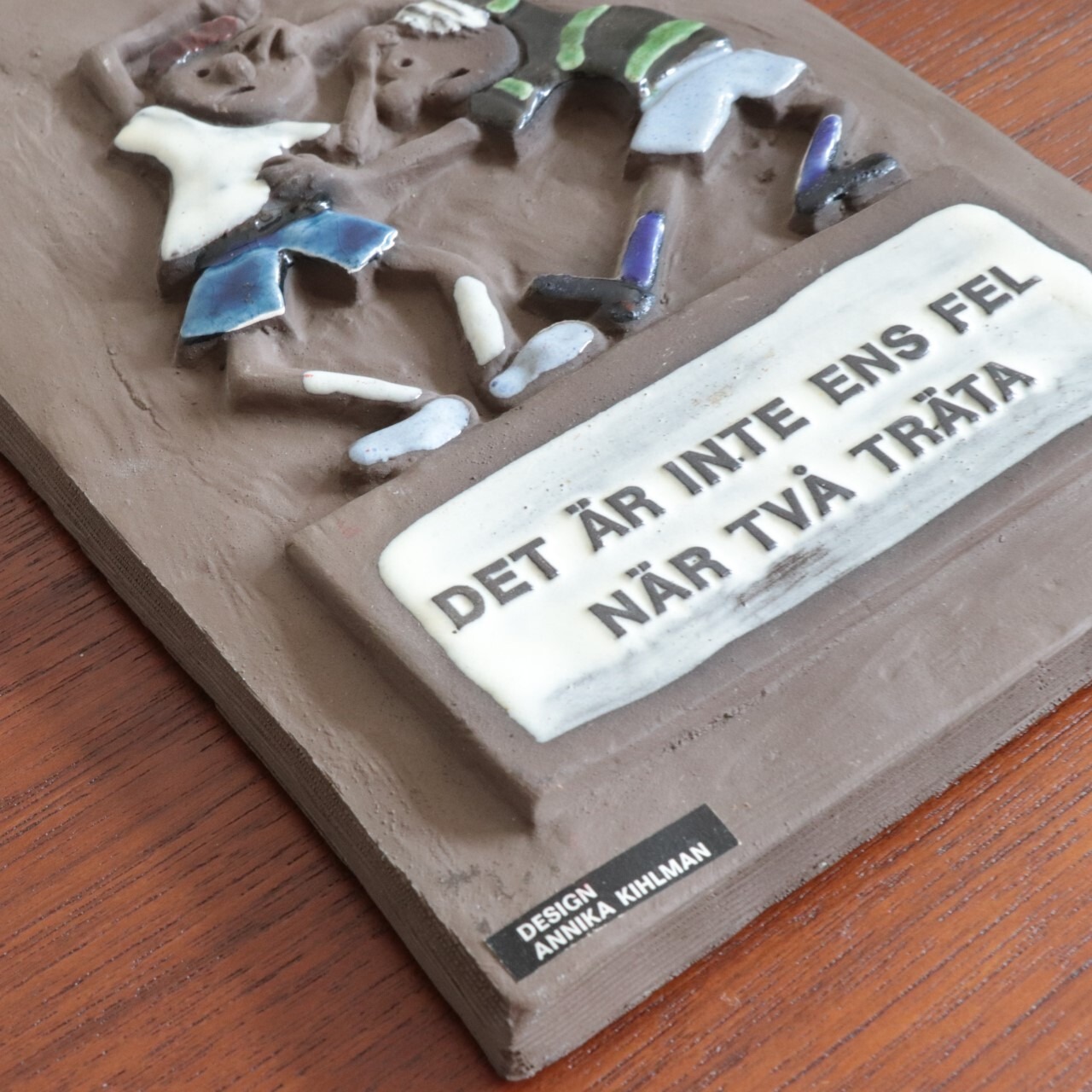 「det är aldrig ens fel när två träter」という言葉が書かれており、直訳すれば「二人が出会っても間違いではない」といった意味となります。ことわざですので、少し柔らかく訳すと「喧嘩をするにも2人が必要だ」といった意味合いの格言のようです。