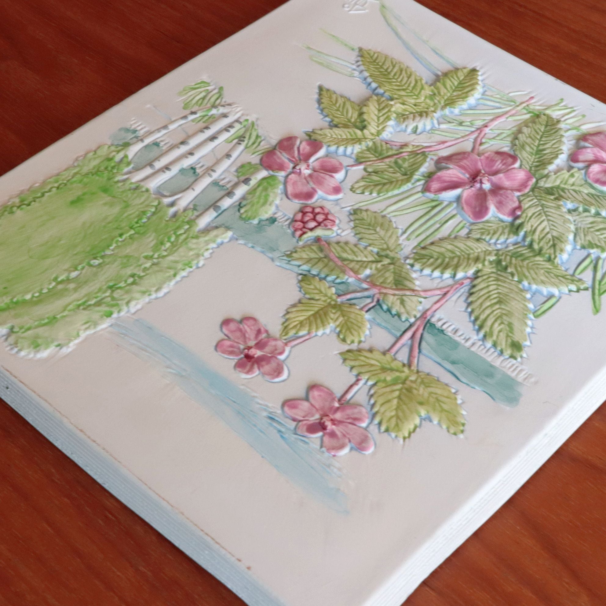 同社の代表的デザイナーAimo Nietosvuori による作品で、スウェーデンの野に咲く花と風景を描いた作品です。背面には通し穴と針金が付いていますので、そのまま壁に飾ることも可能です。