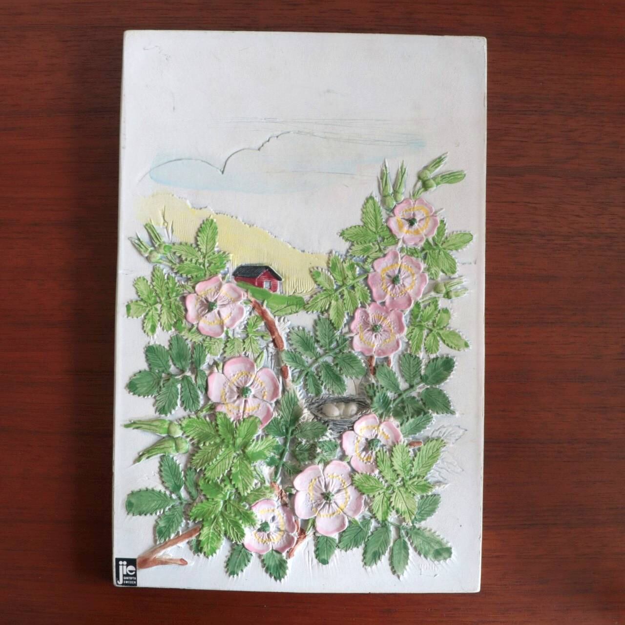 同社の代表的デザイナーAimo Nietosvuori による作品で、手元に可憐に咲く花々、鳥の巣と卵、遠景にはスウェーデンの赤い家と自然の豊かさとそこに暮らす人の暮らしが描かれた作品です。背面には通し穴と針金が付いていますので、そのまま壁に飾ることも可能です。