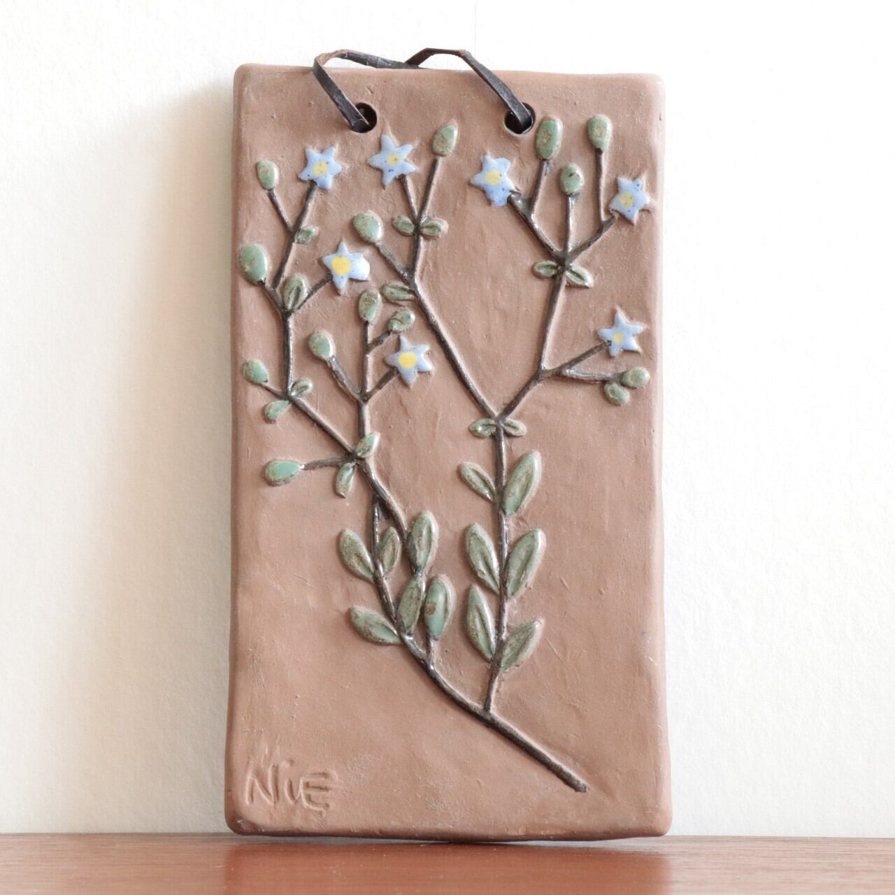 スウェーデンのBromma Keramikで製作された壁掛けの陶板。ワスレナグサ(勿忘草)を描いたもので、適度なデフォルメが可愛い、Ninnie Forsgrenが手がけたデザインとなります。