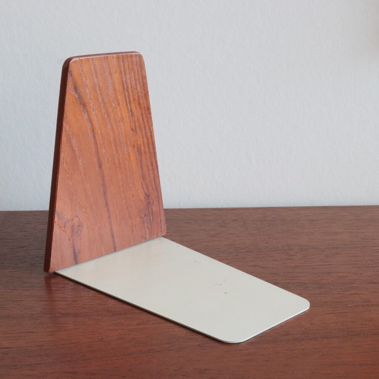 1960年代頃にデンマークで製作されたブックエンド。L型の金具にチーク材で出来たストッパーを組み合わせたデザインです。