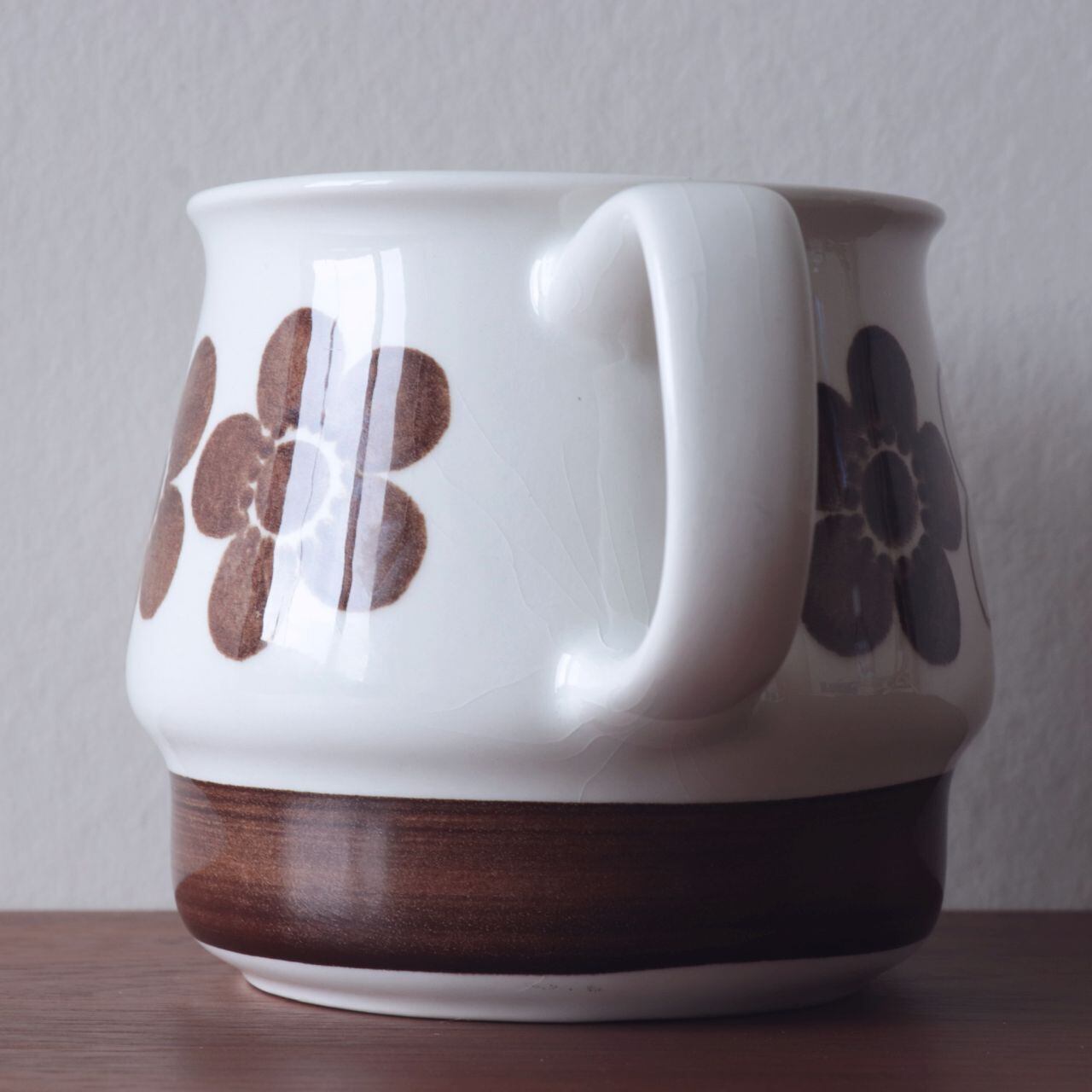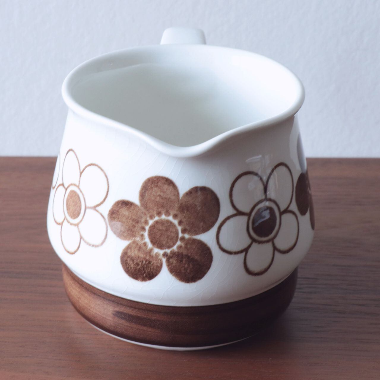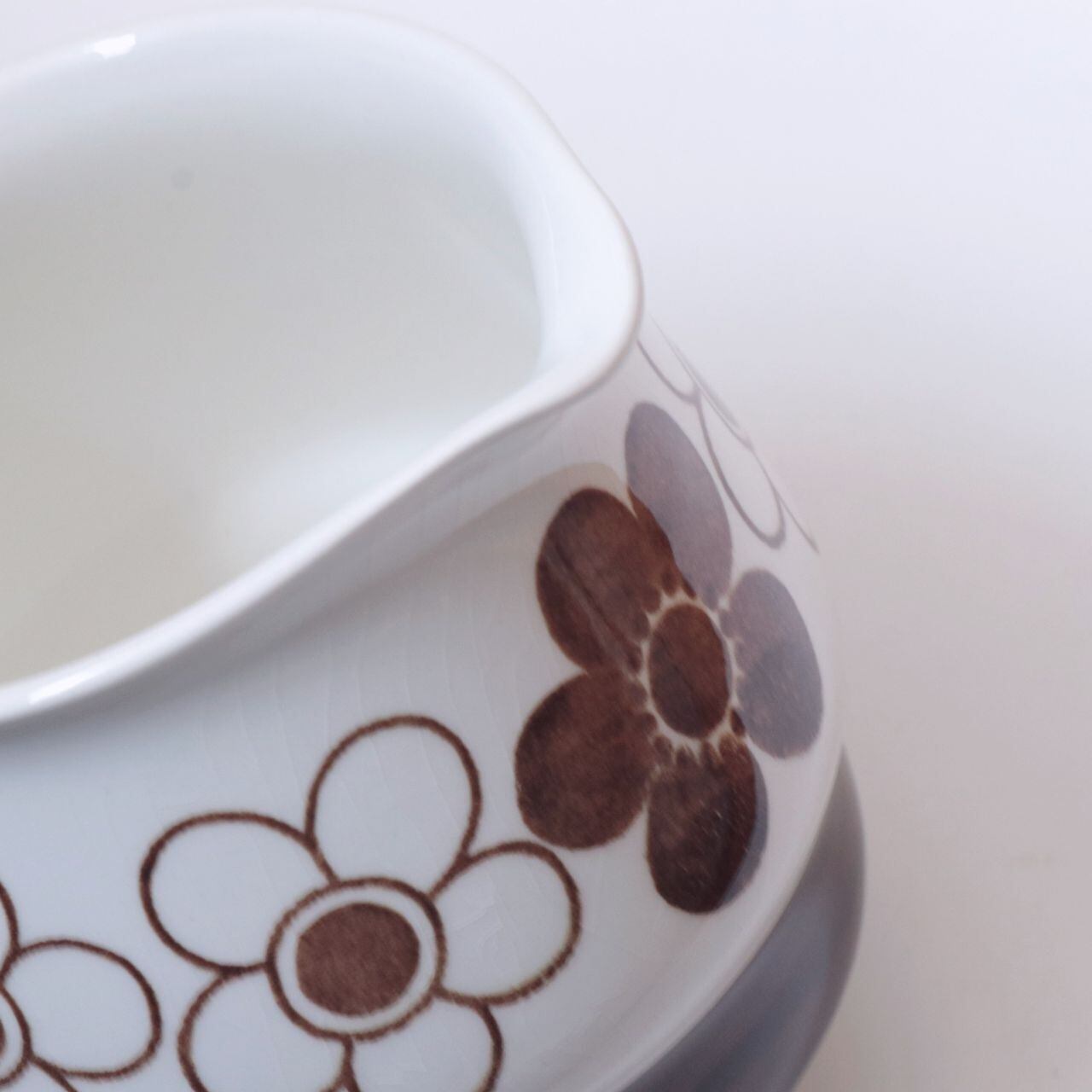 掠れたような独特のテクスチャで描かれた花模様が特徴的です。白地にブラウンが中心ですが、花柄がブルーとなったパターンも製作されています。パターンの花柄はスクリーンプリントで、縁取りやディーププレートの中央部は筆や刷毛で描いたもので、かすれ具合や柄の出方がそれぞれ少しずつ異なっています。同様の仕上げはロールストランド社でも他に例が無く、どの機械を使って仕上げたものかは不明とされている不思議なシリーズです。